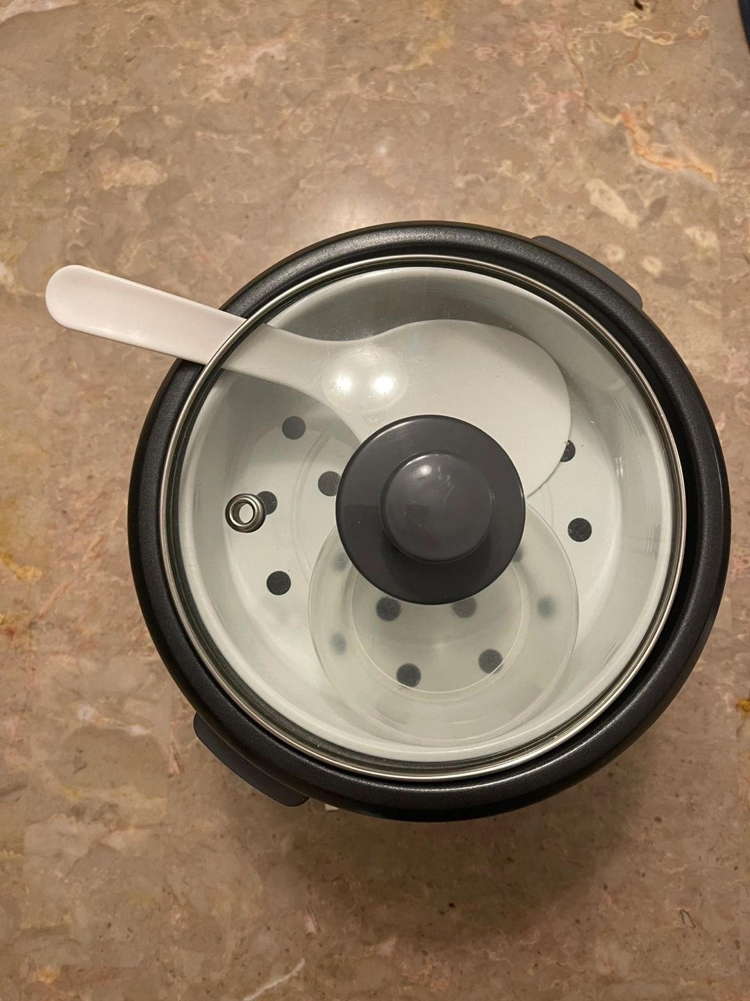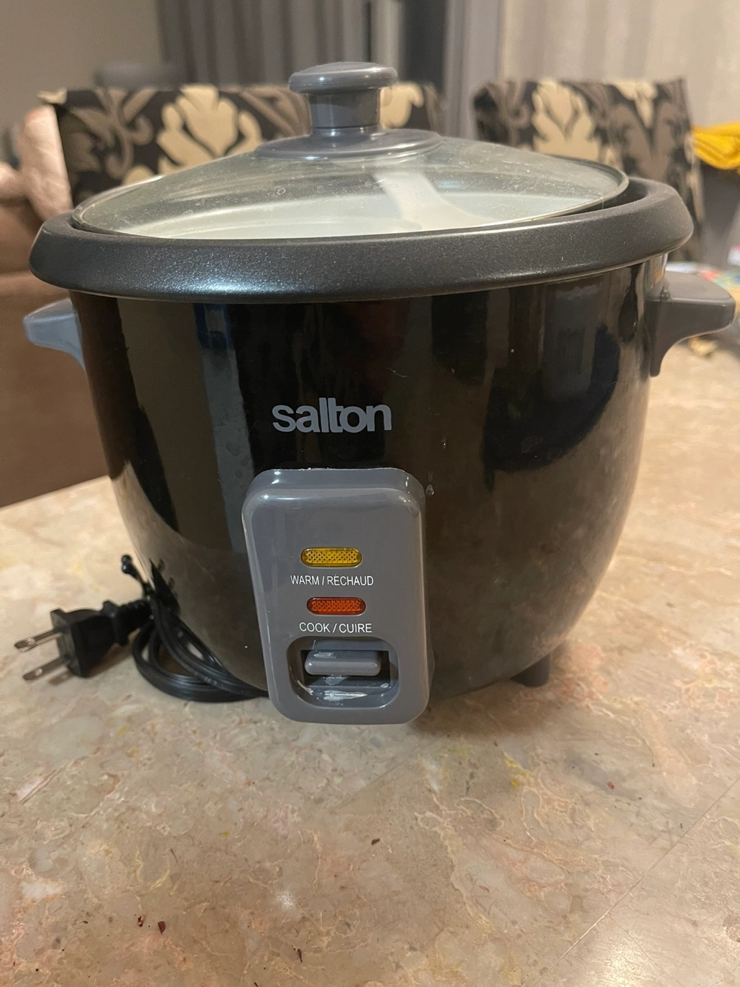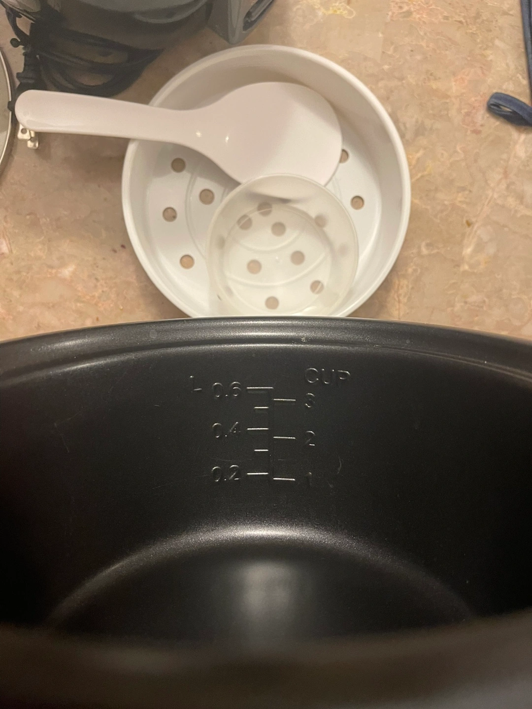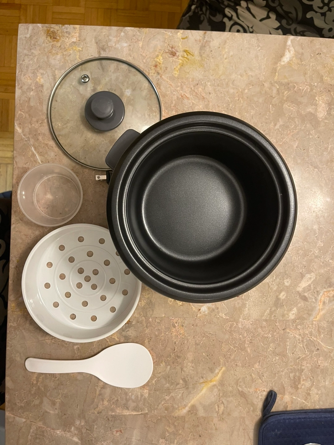 Rice cooker with glass lid, steamer basket, measuring cup, and rice paddle. Includes cord.