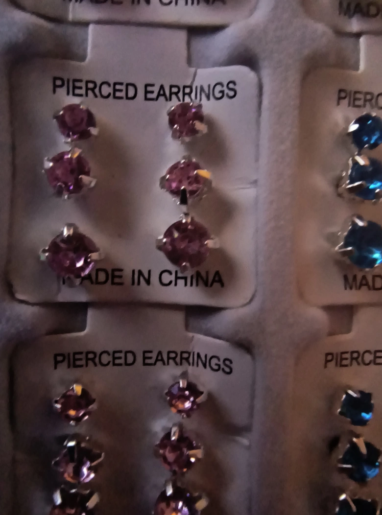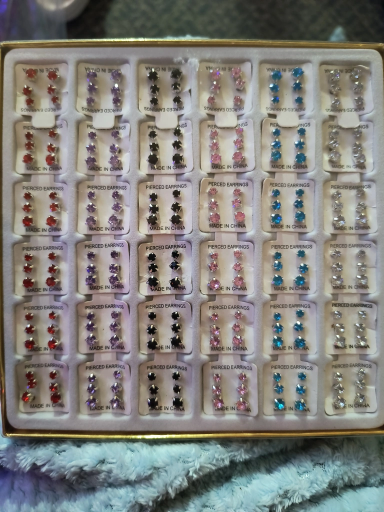 Assortment of crystal stud earrings. Includes red, purple, black, pink, and blue. 108 pairs in total. take the entire box please. last minute Christmas gift, I am available in the afternoon today(December 24) for purchase in the Weston and Lawrence area. $20 firm.