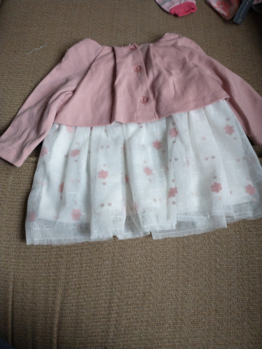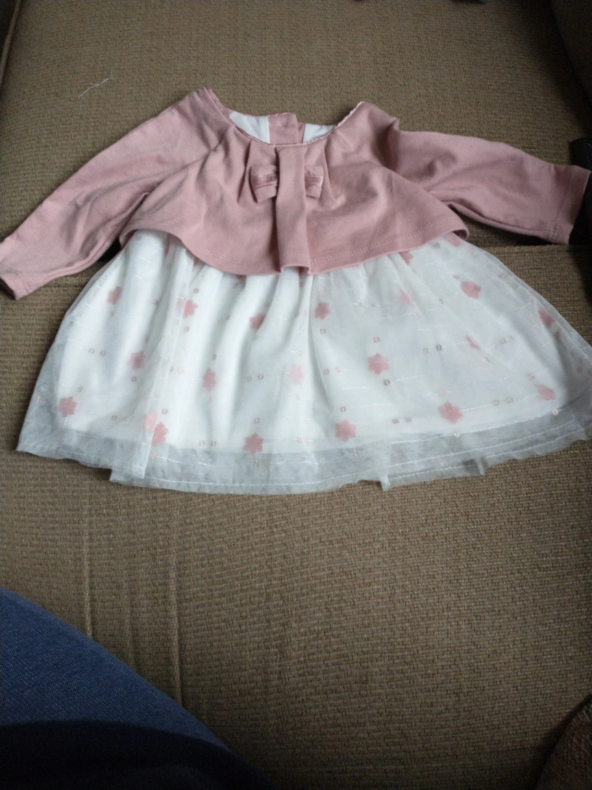 Pink and white dress with long sleeves. The top is a pink sweater with a bow. The bottom is a white tulle skirt with pink flowers. Button closure in the back. pick up at Creditview and Bristol Rd West outside Pizza Hut at River Run plaza. Final sale.