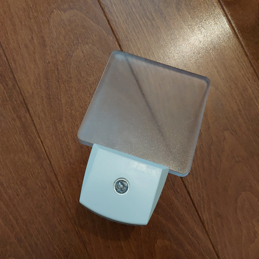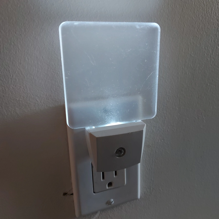 White plug-in night light. Emits a soft, white light. Iced for a couple of months. selling because I got a better one. Pick up at Pape Station.