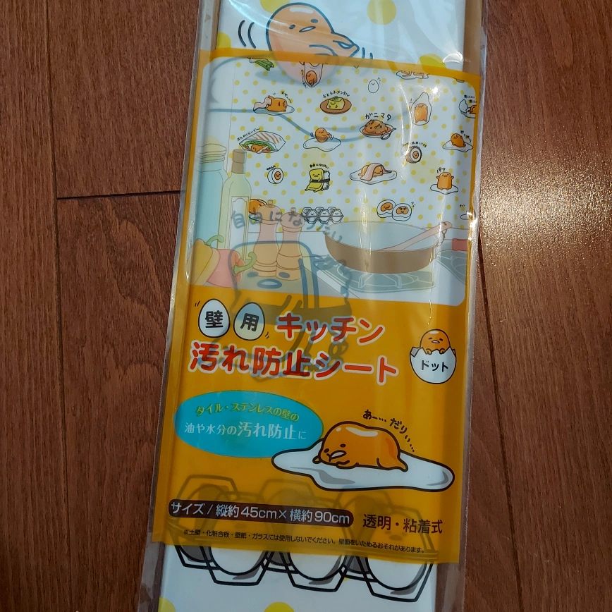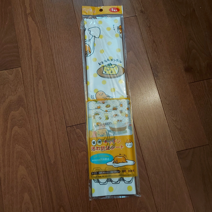 Oil and water resistant sheet for kitchens. Features Gudetama design. It's a foil like material you can stick to your kitchen wall or wherever to catch splatter from cooking etc. I never ended up using it. Pick up at Pape Station.