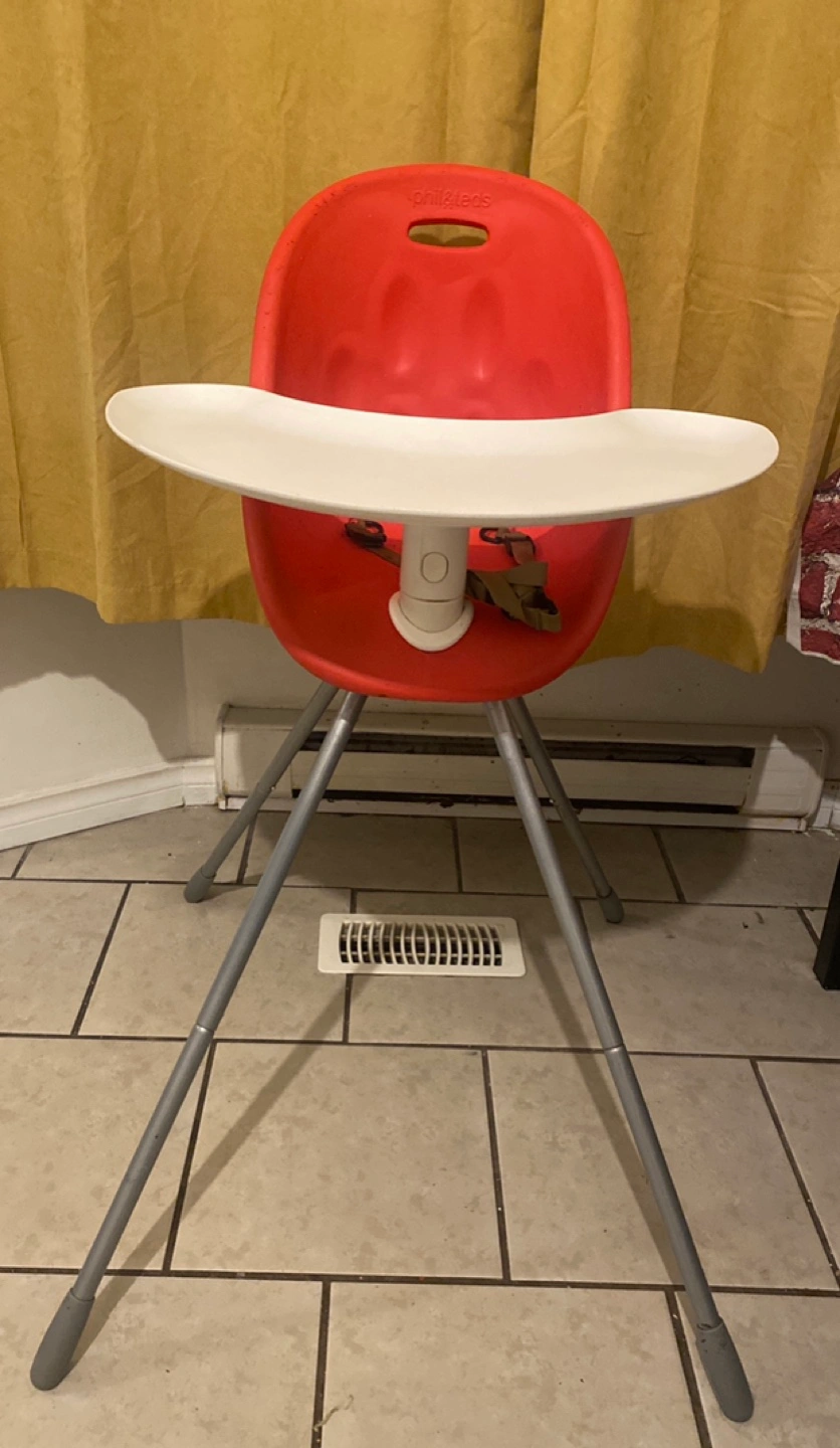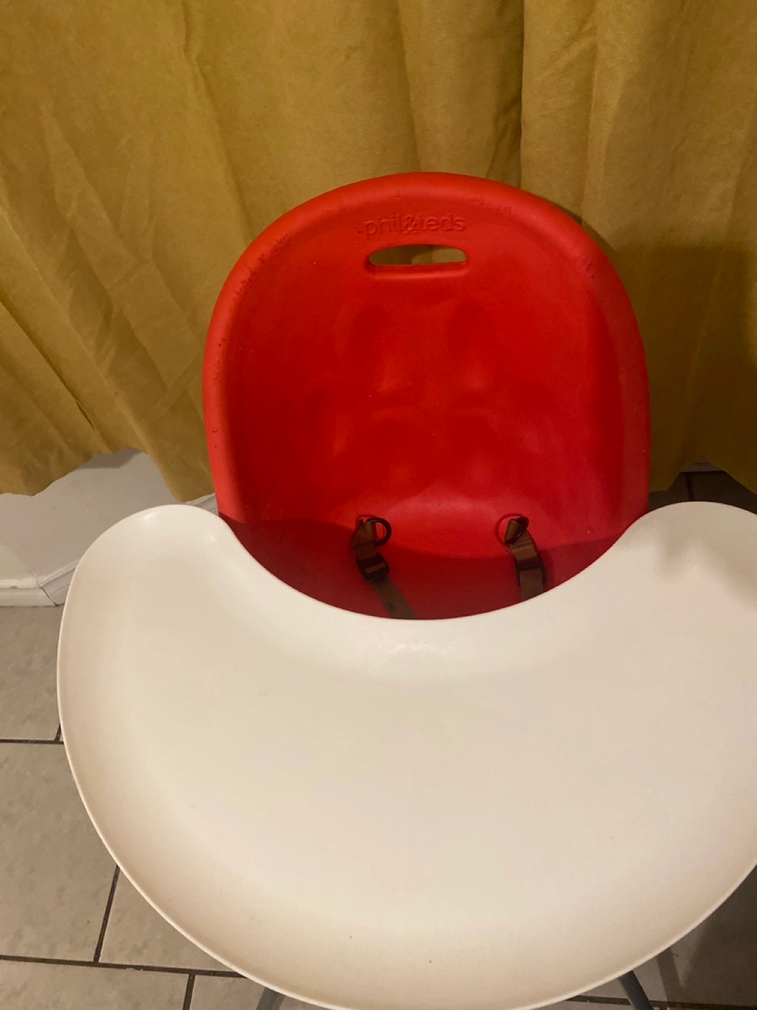 Phil and Ted’s High chair with tray. Red seat and white tray. Adjustable height.