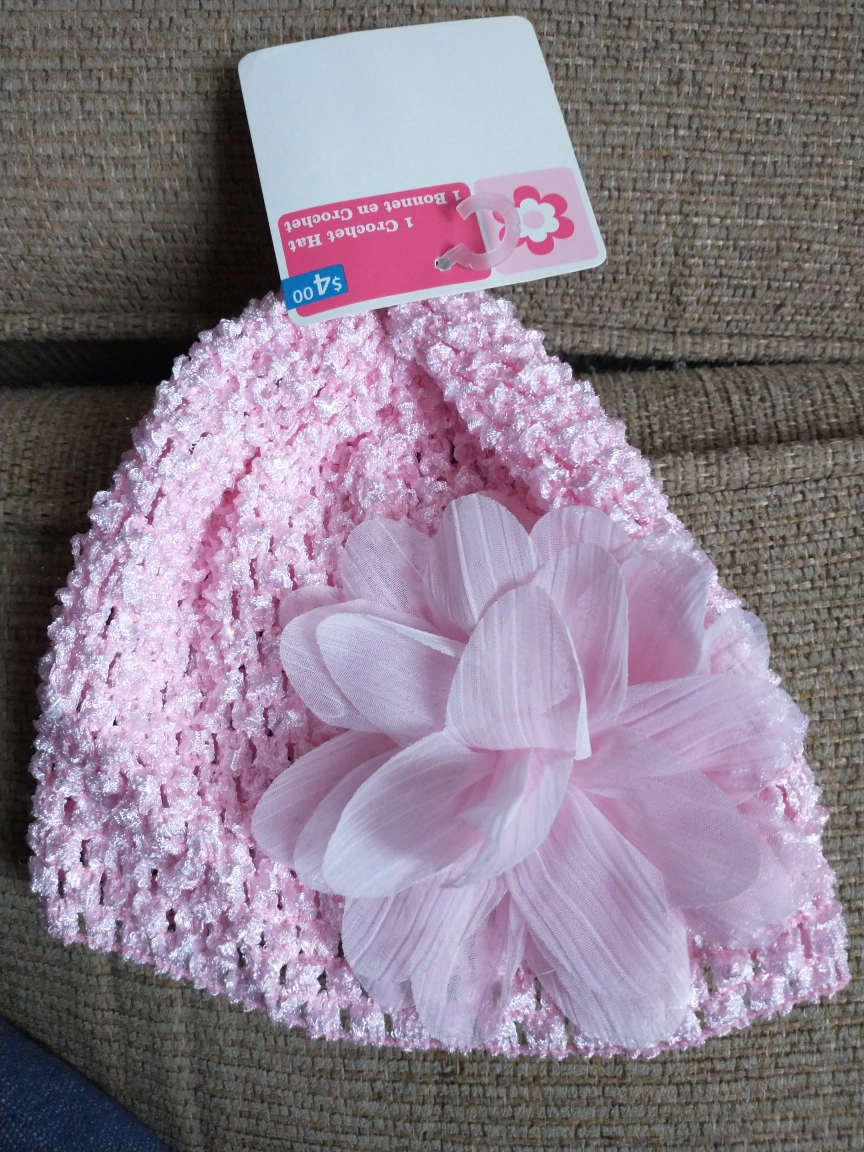 Pink crocheted baby hat with a flower. Very cute! pick up at Creditview and Bristol Rd West outside Pizza Hut at River Run plaza.