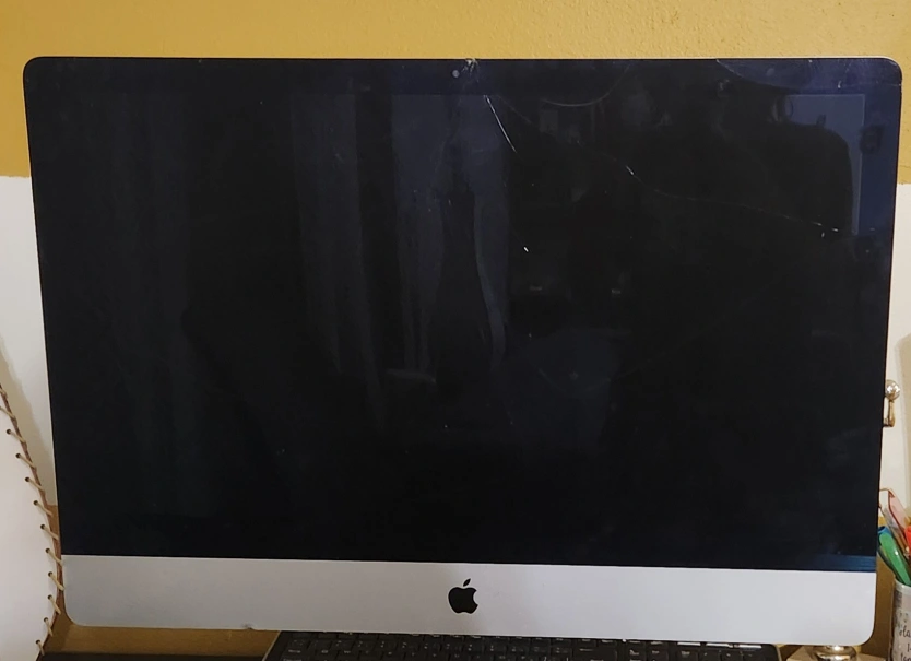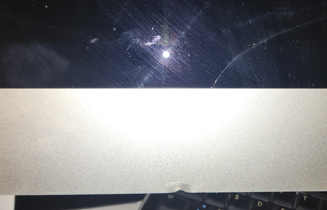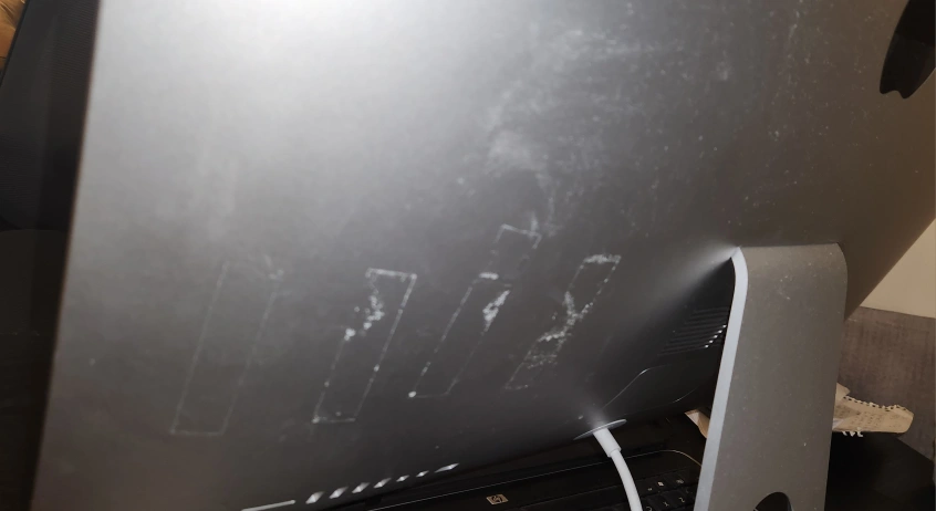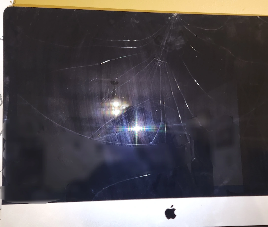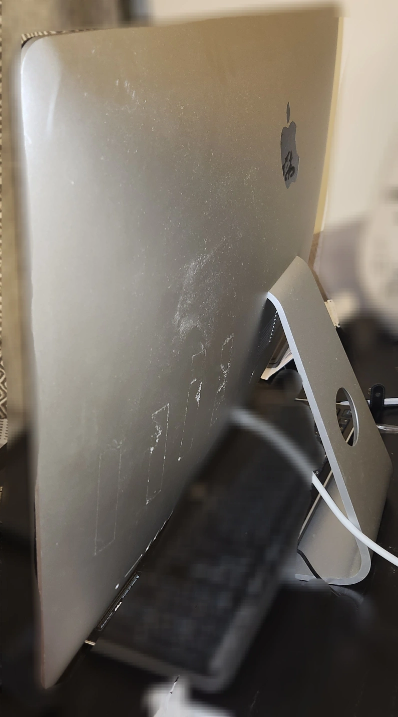 Screen is cracked but it doesn't impact the use or visuals portrayed by the product, or the effectiveness of it. Slight dent at bottom left of screen (doesn't impact usability). Sticker marks at the back. Product works as if it were new.