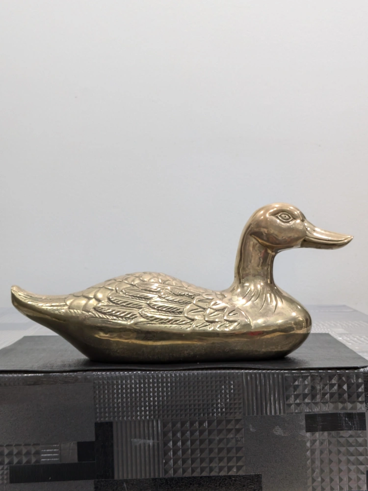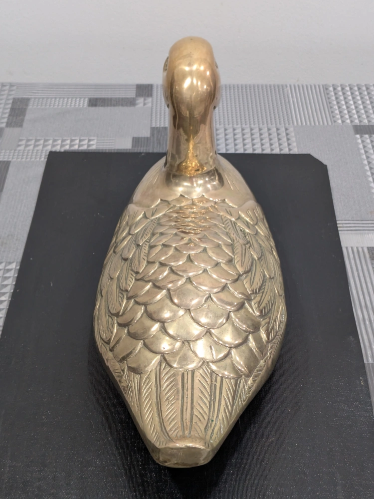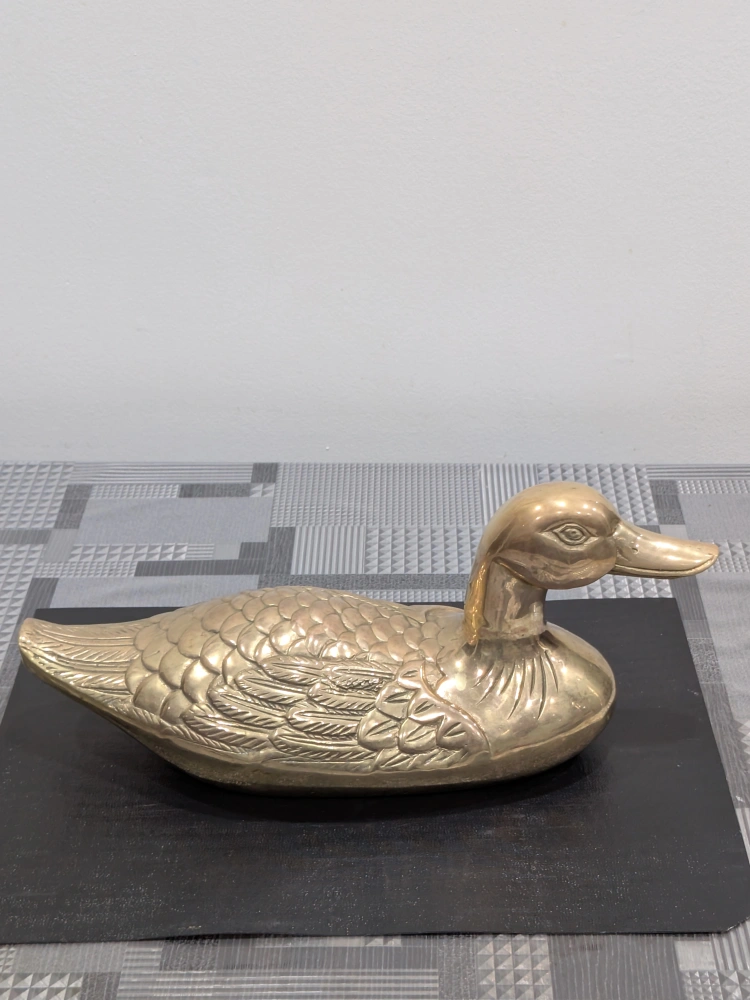 Large and heavy vintage brass duck, beautifully detailed and expertly crafted. A perfect piece to enhance your home decor. Measures 16.5" long, 6" wide, and 7.5" high. Weighs 10 pounds.