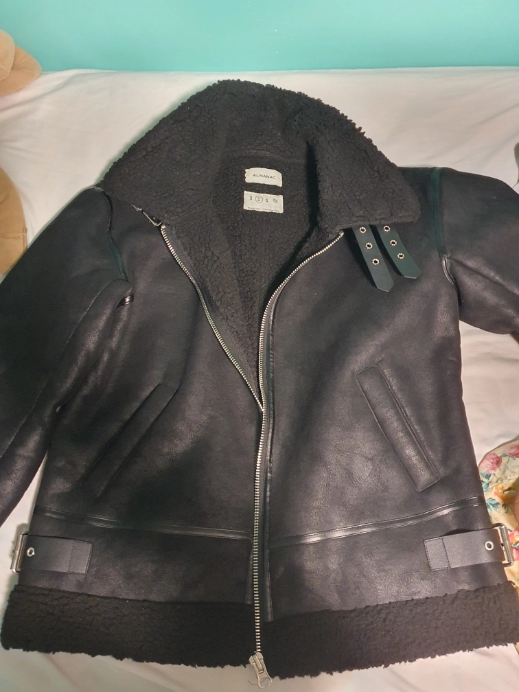 Black shearling jacket with a zipper closure and belt detailing. It has a collar and is lined with fleece.