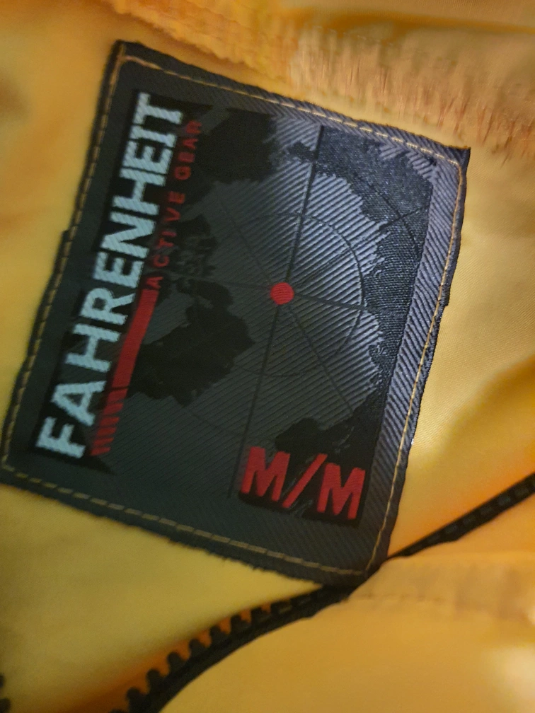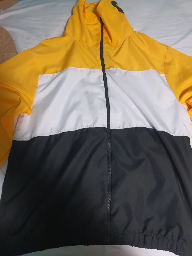 Yellow, white, and black colour-blocked jacket. Zipper closure. Hooded.