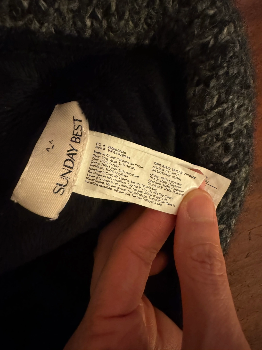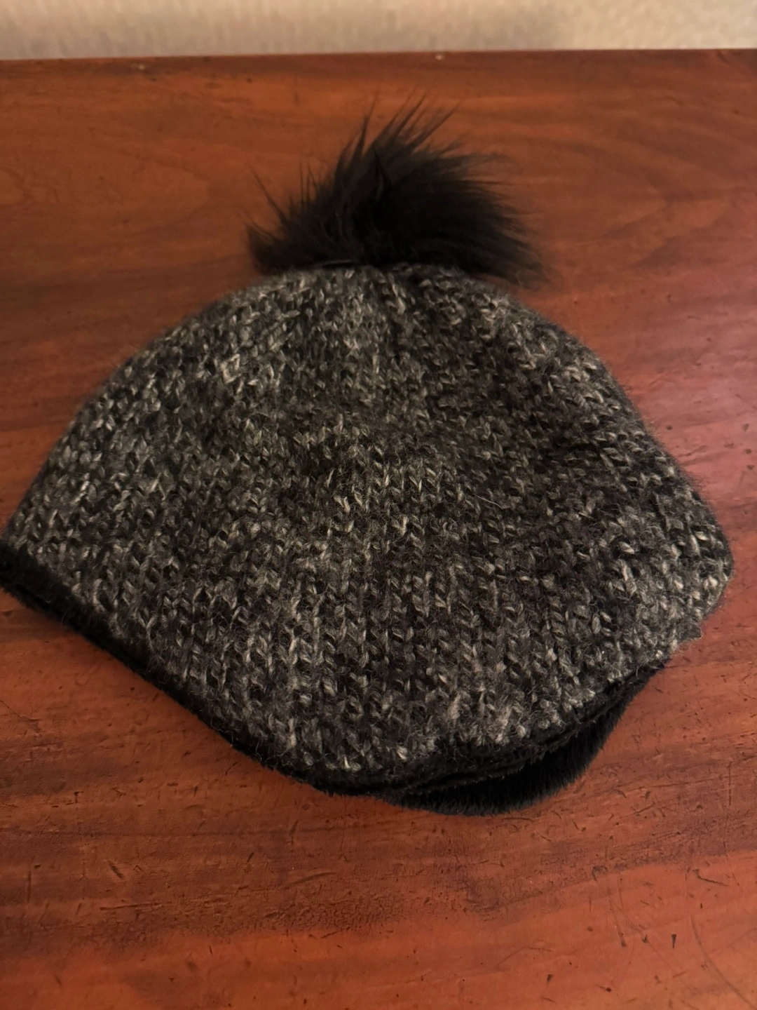 Grey knitted beanie with a faux fur pom pom. Lined with black fleece. One size.