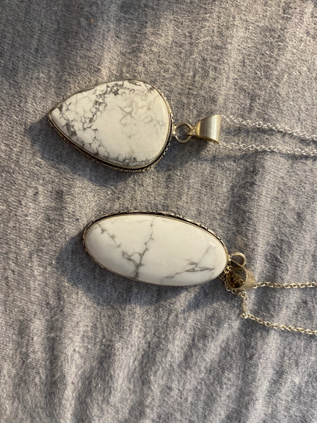 Set of Two howlite stone pendants on silver chains. Pendants are in different shapes. Both are brand new from Happy Soul Retail for $30 plus tax each Take ‘em both for $20!($10 each) Make great gifts