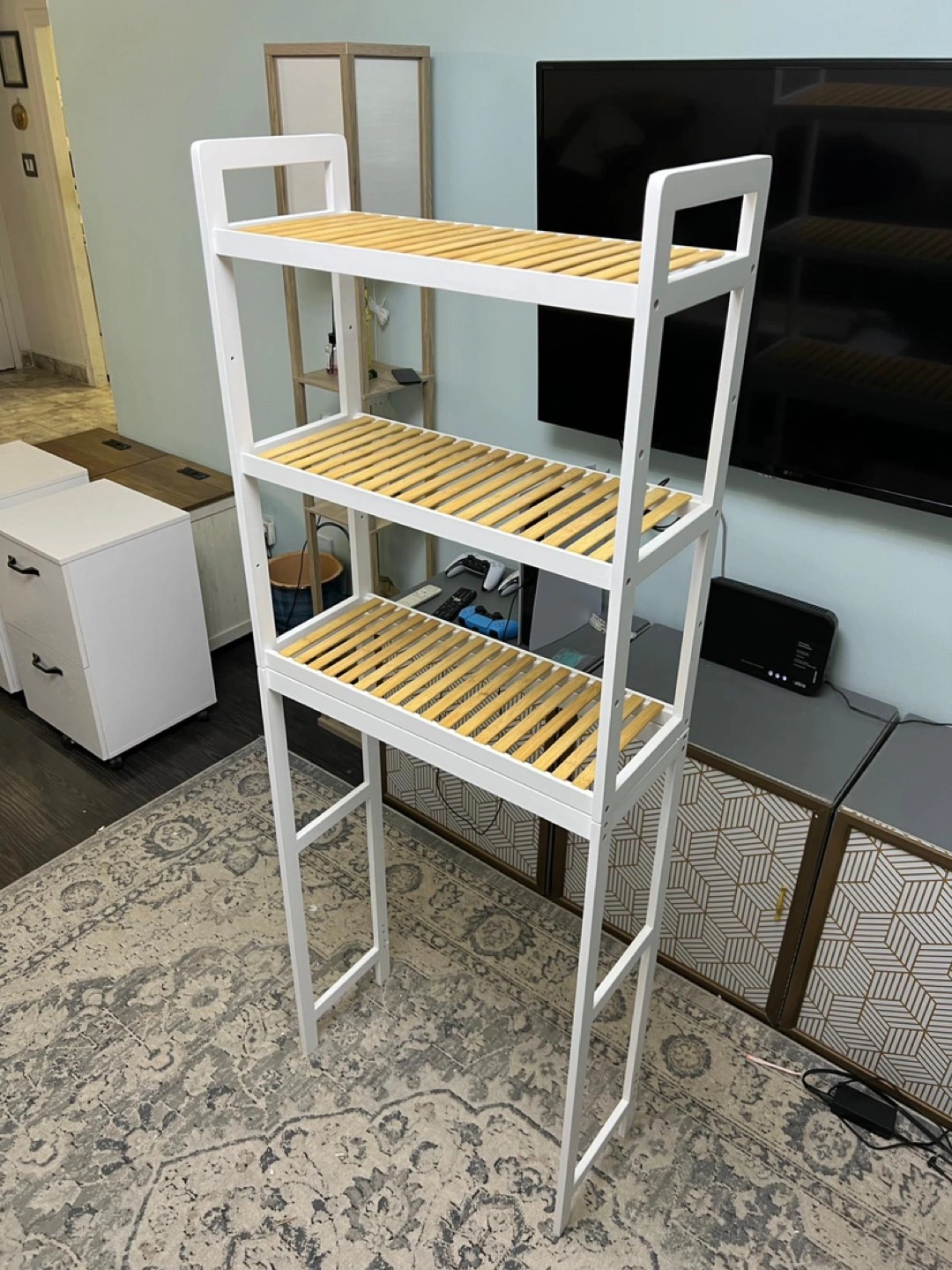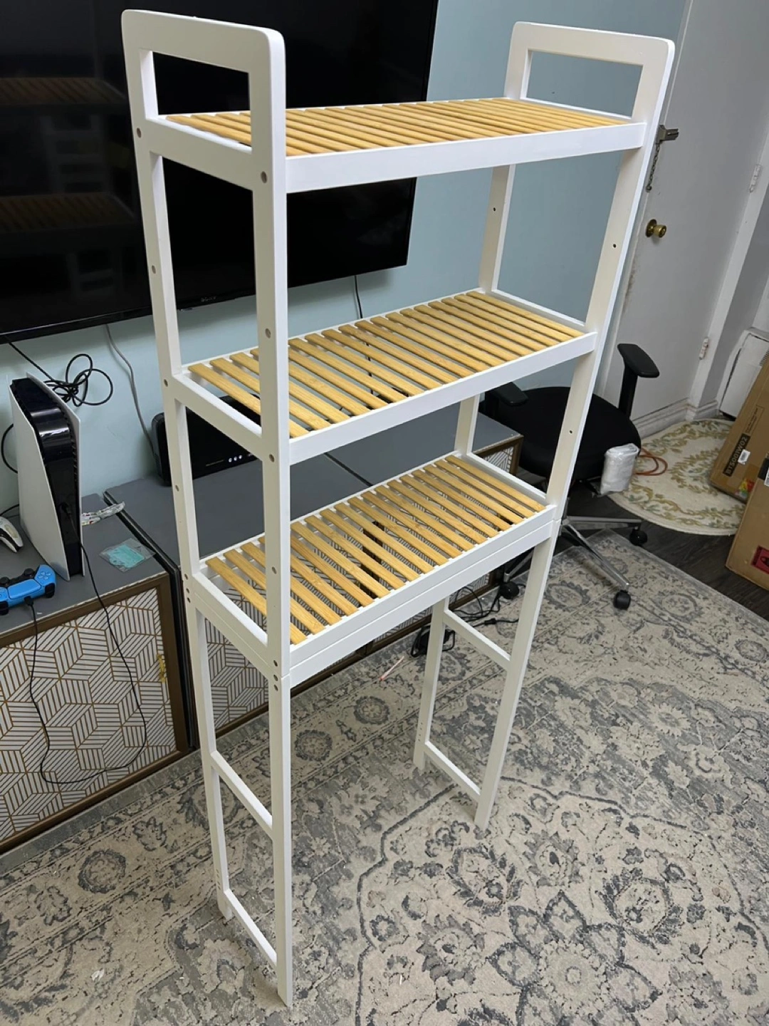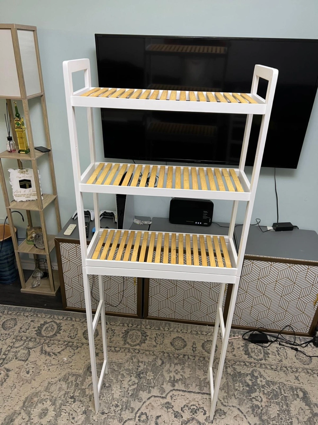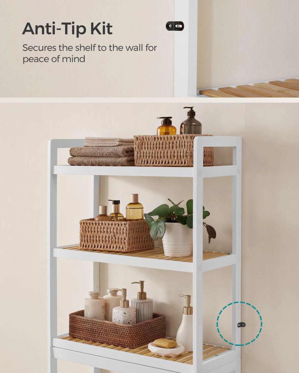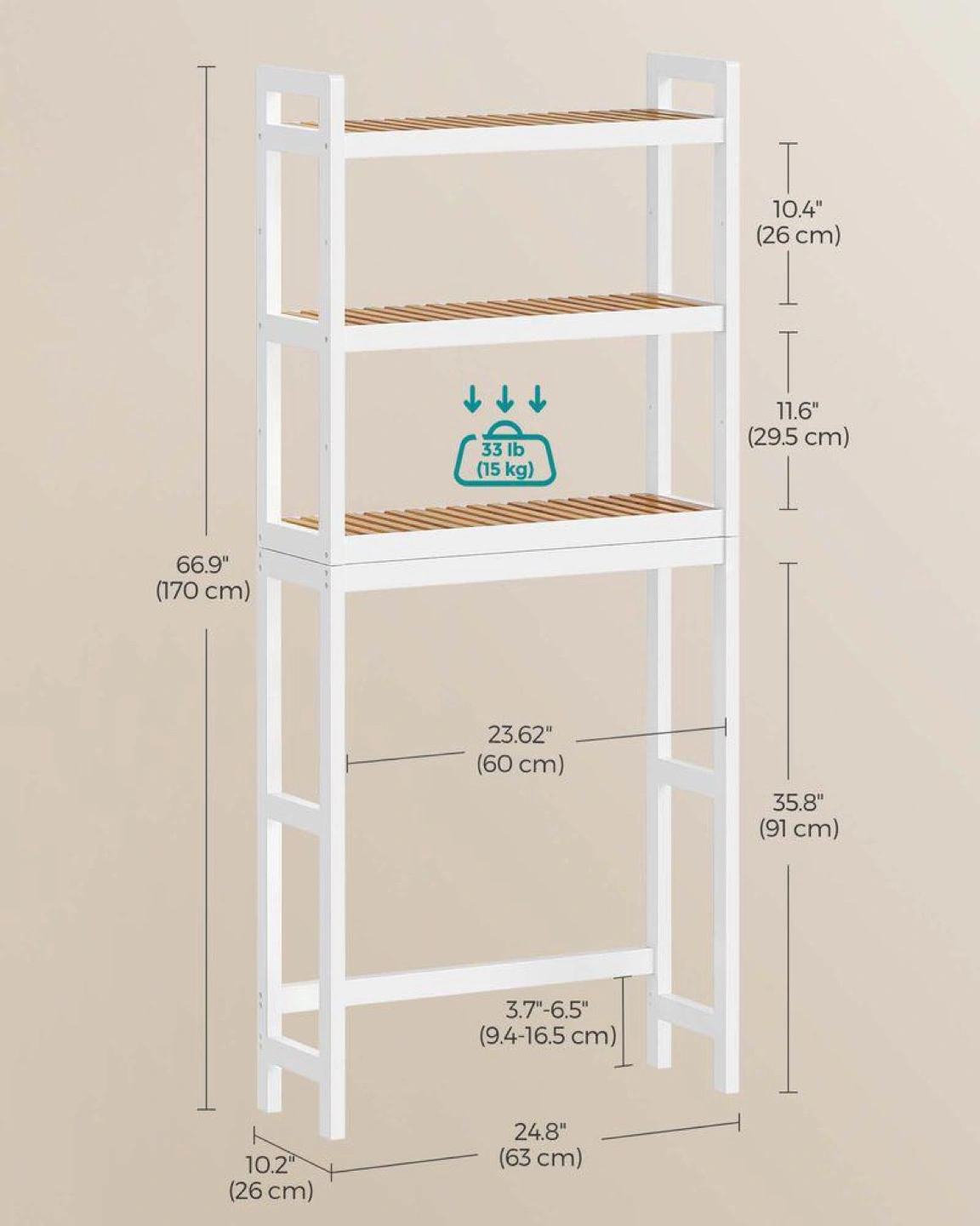 White over-the-toilet storage shelf with shelves. Includes anti-tip kit. Brand new VASAGLE