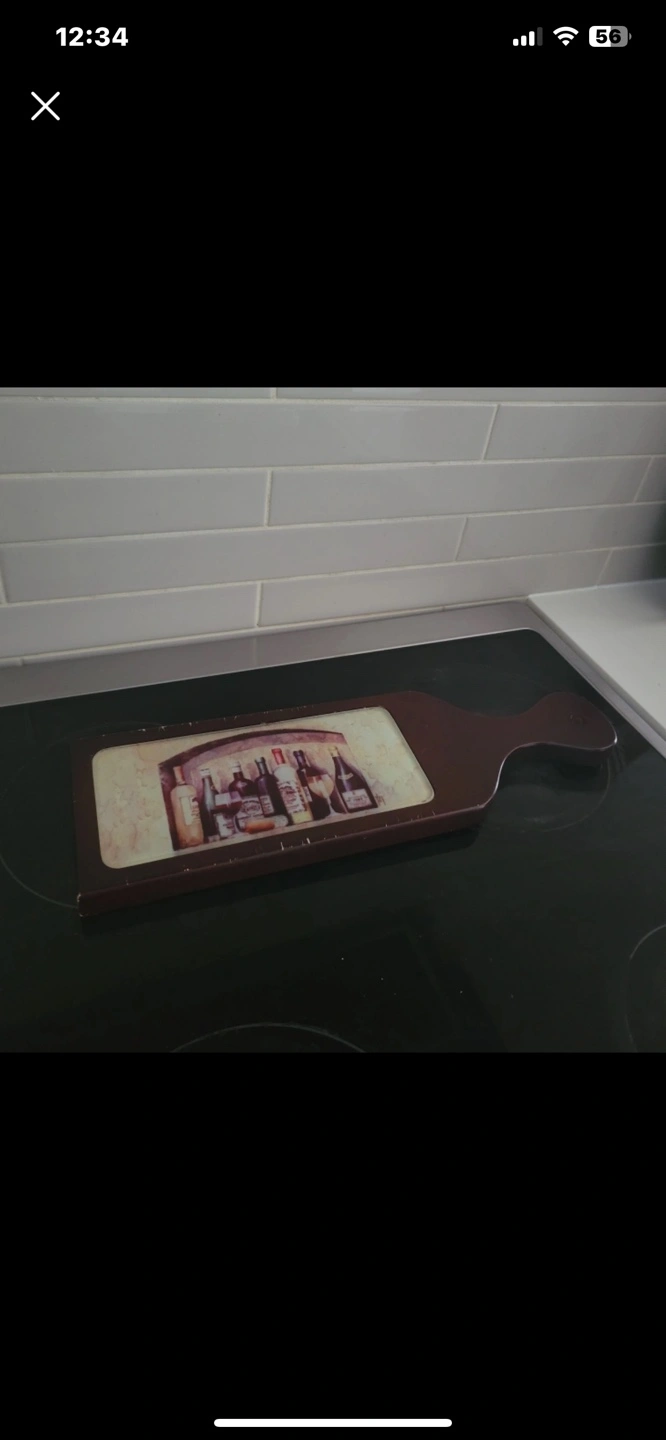 Wooden serving board with a picture of wine bottles. Features a handle. Great for entertaining! Note - There are some scratches but it is in good condition, Surface is wood and glass
