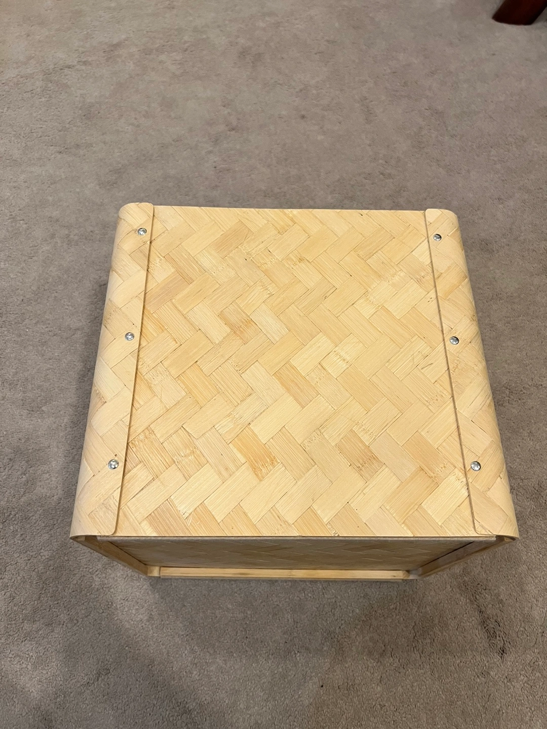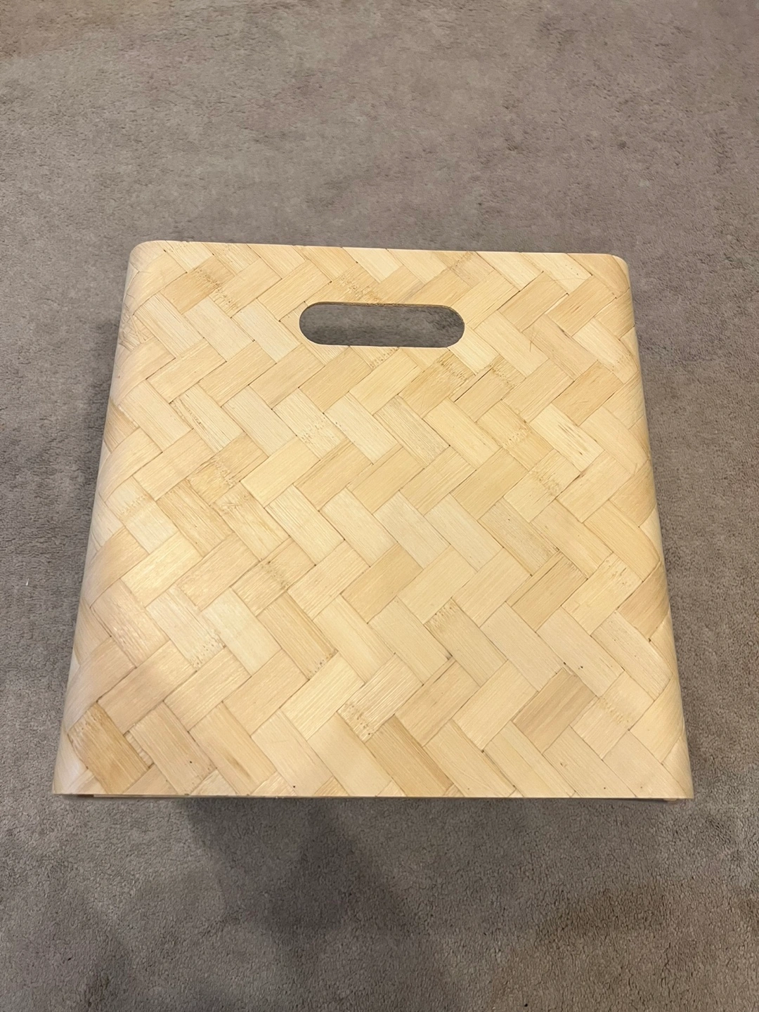 Square shaped storage basket made of woven bamboo. Has a handle on top. The material is very sturdy.