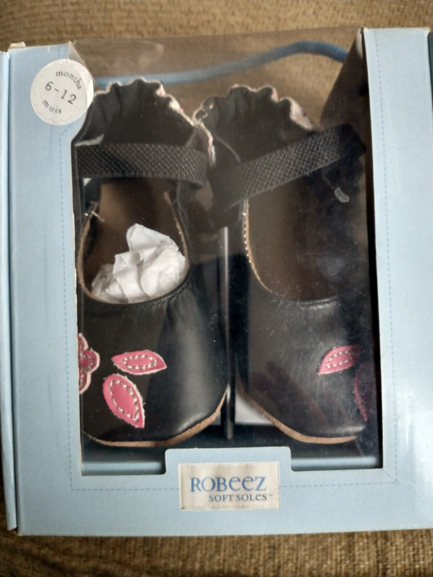 Black leather baby shoes with pink accents. Size 6-12 months. pick up at Creditview and Bristol Rd West outside Pizza Hut at River Run plaza. final sale.