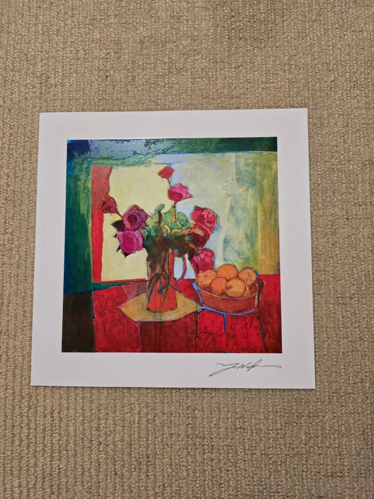Signed art print of a still life featuring flowers and fruit. 7" x 7" "Breakfast table" 2015 Seriolithograph in color on archival paper Signed in the plate