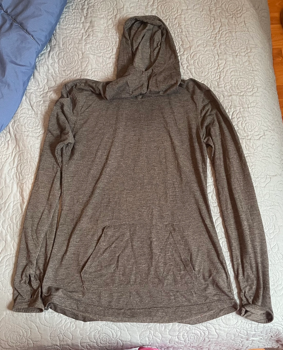 Grey long sleeve hoodie with a pouch pocket. There’s a lot of lints