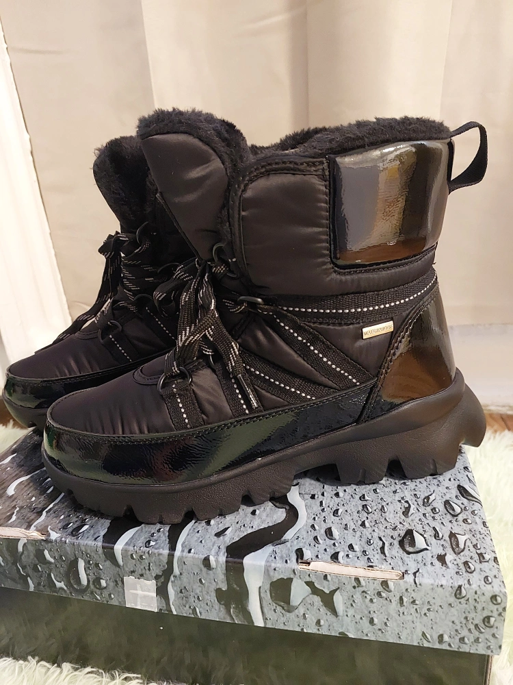 Never worn. Black winter boots with fur lining. Lace up style. Waterproof. Comes with a box. Original price: $198 Selling for $100