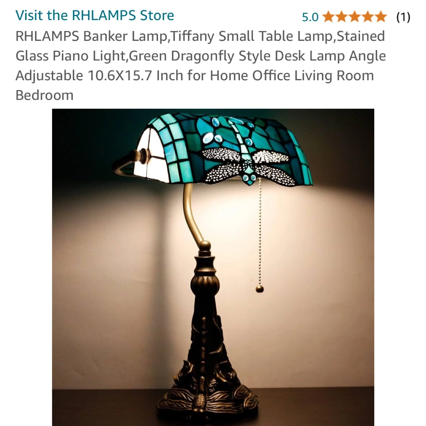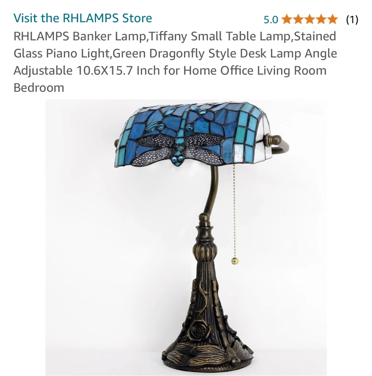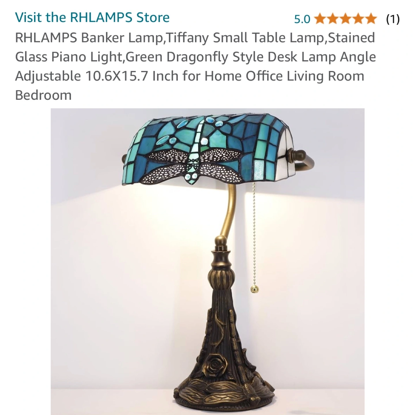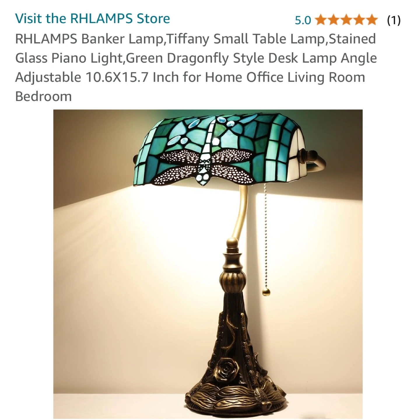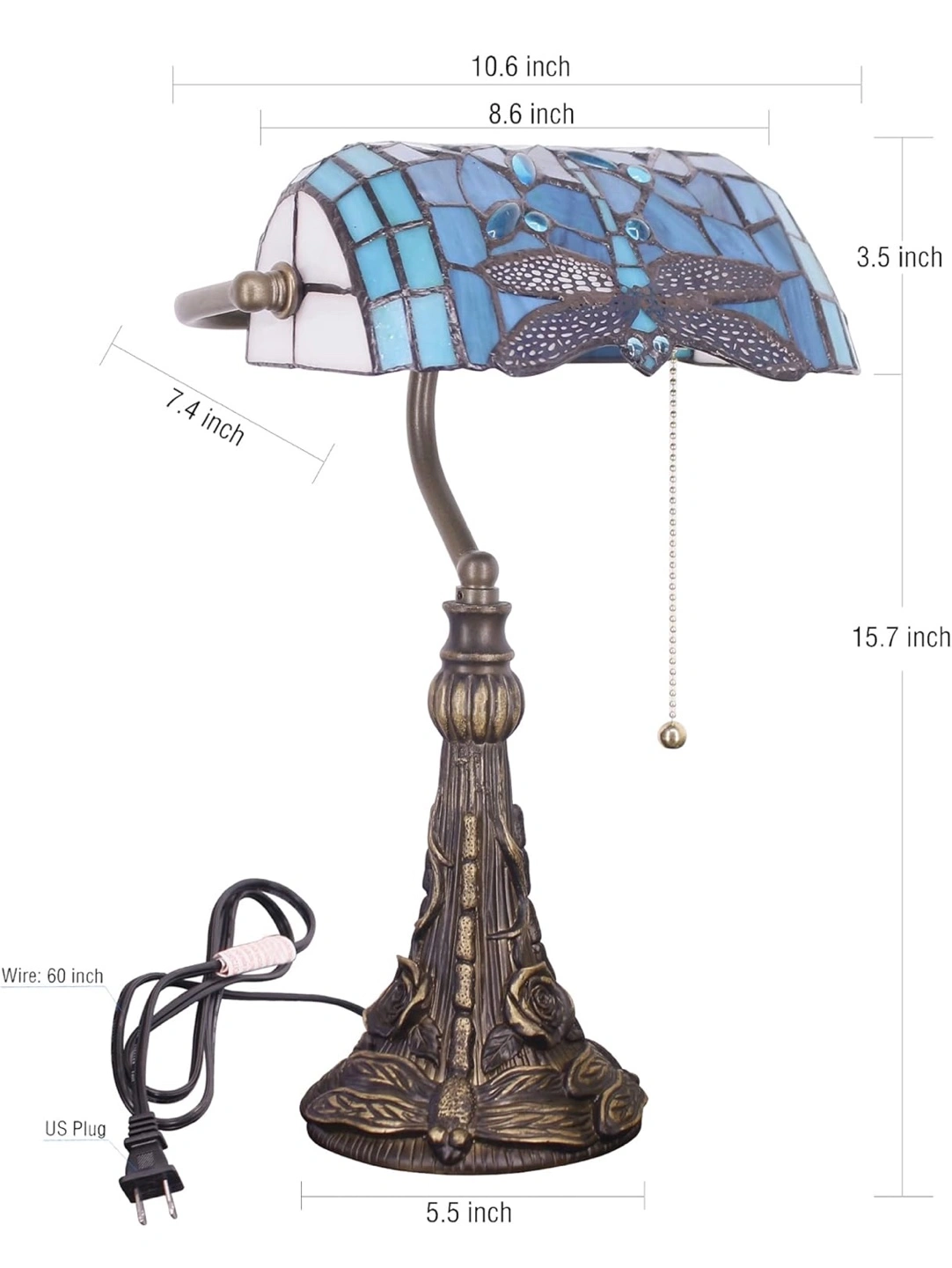 Stained glass table lamp. Angle adjustable. Features a dragonfly design.