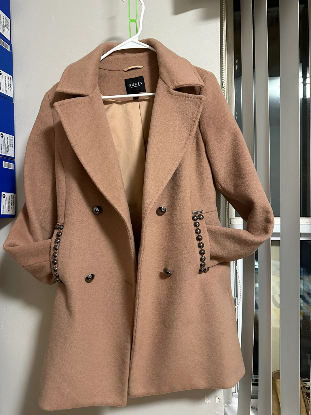 Women's Guess peacoat. Double breasted with button closure. Features a decorative studded detail on the sleeves. -pick up Only -cash Only ๐ค๐