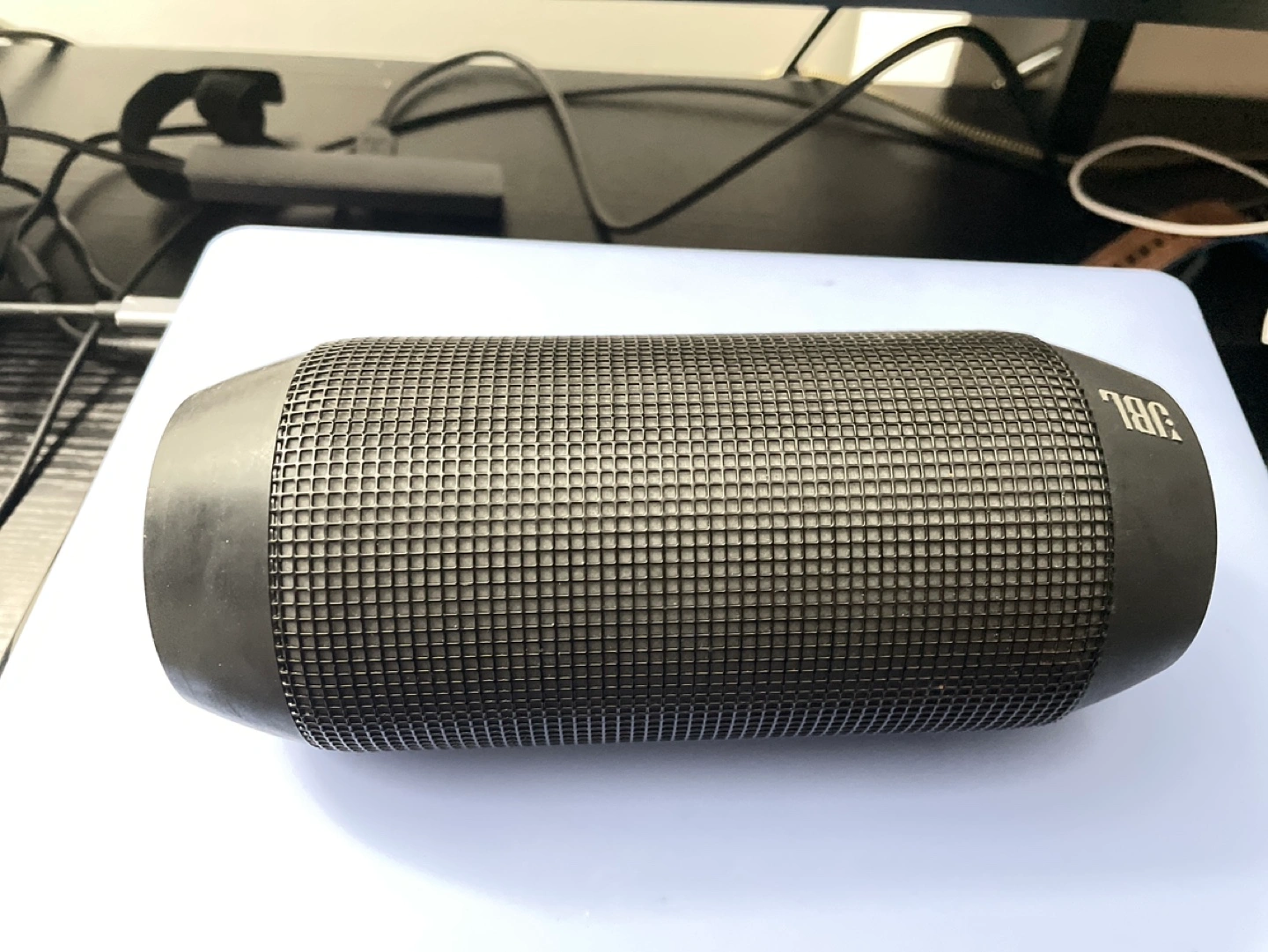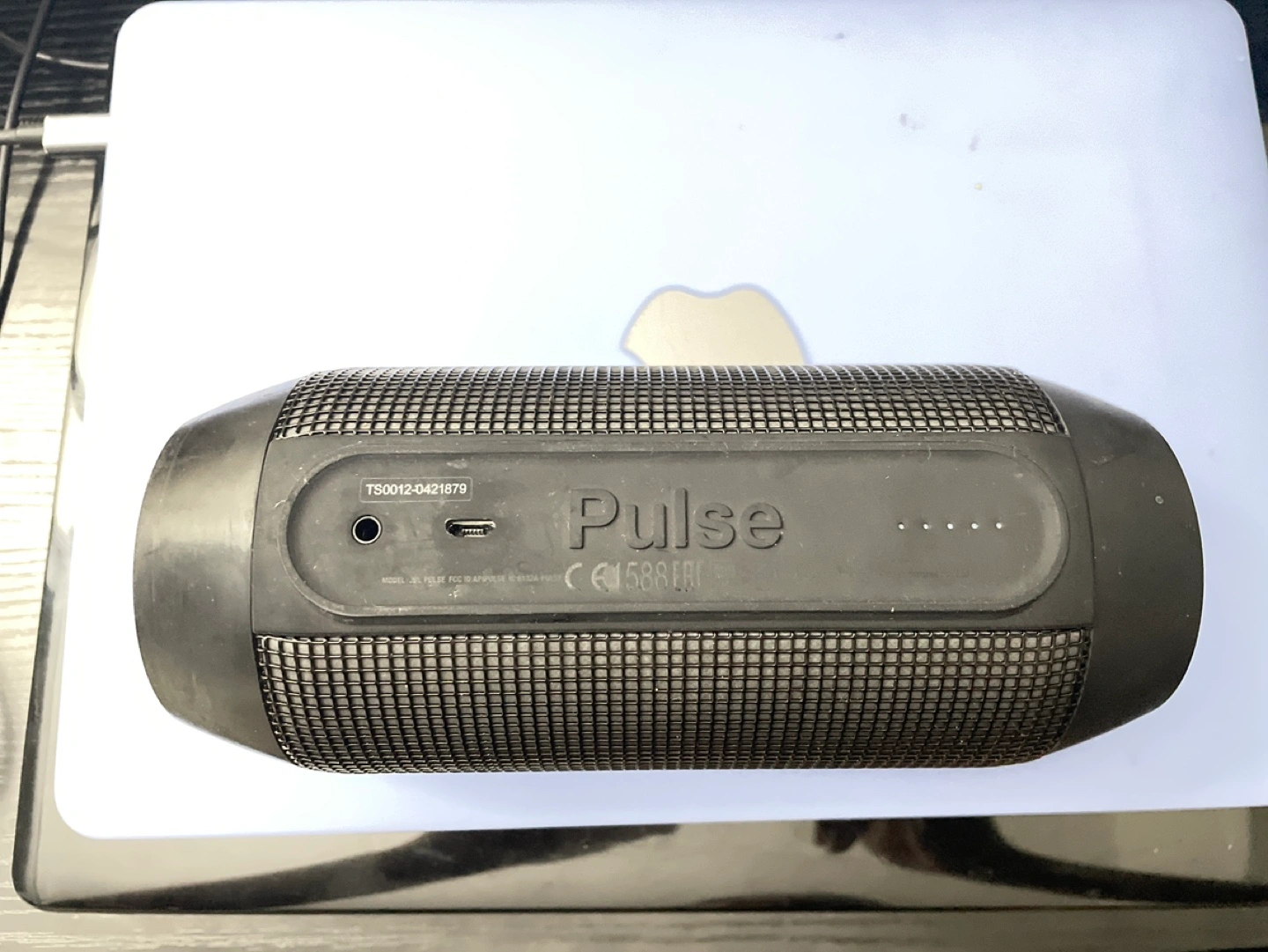 Black JBL pulse portable bluetooth speaker. Works well but always charger needs to be plugged in.