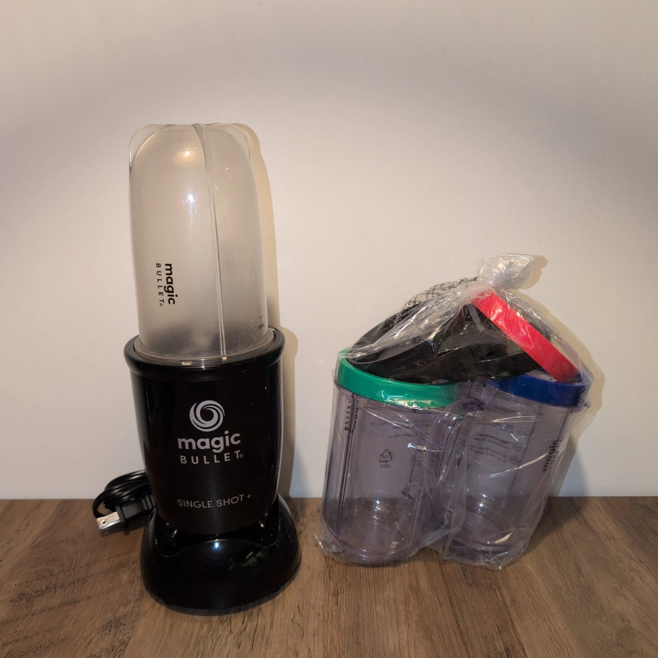 Magic Bullet Single Shot blender with multiple cups and lids. 2 brand new cups and 6 brand new lids included.