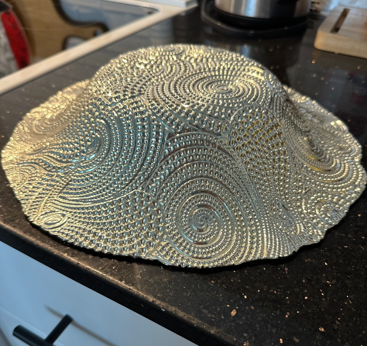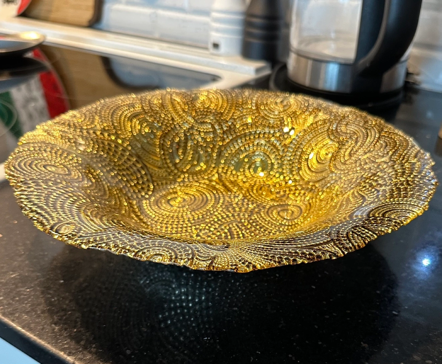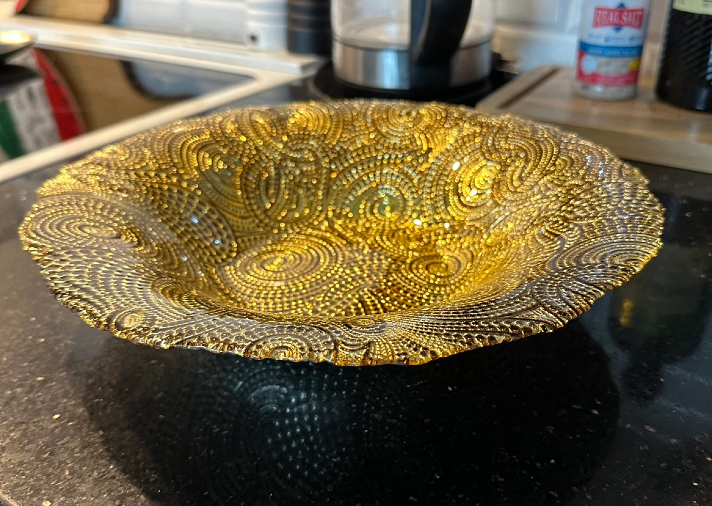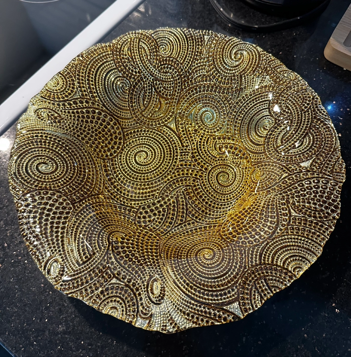 $10-brand new Round Large, gold, glass serving bowl with a unique pattern. Suitable for snacks, fruit, etc.Turkish made from homesense , no cracks scratches .thanks
