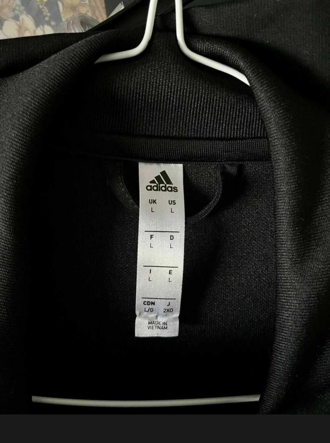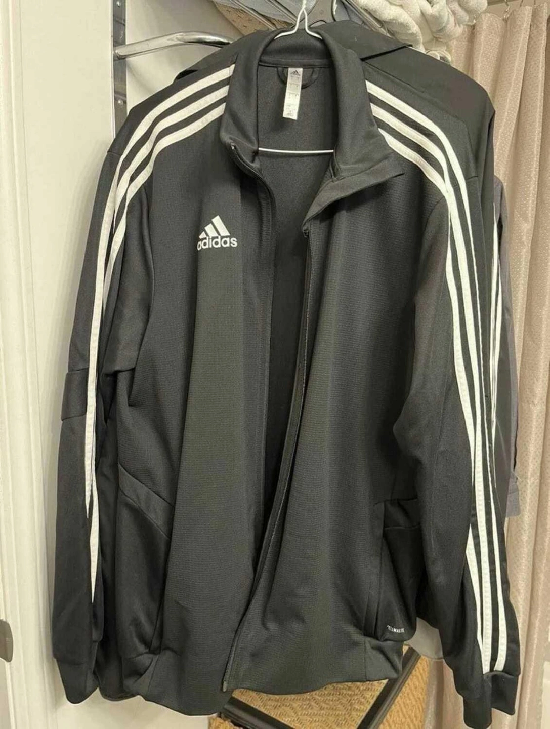 Black Adidas track jacket with white stripes. Zip up, long sleeves. Size Large.