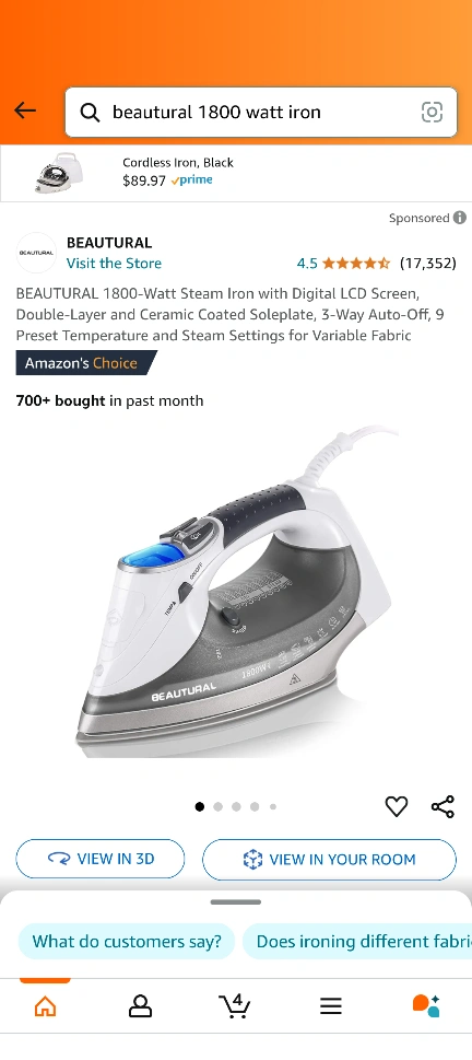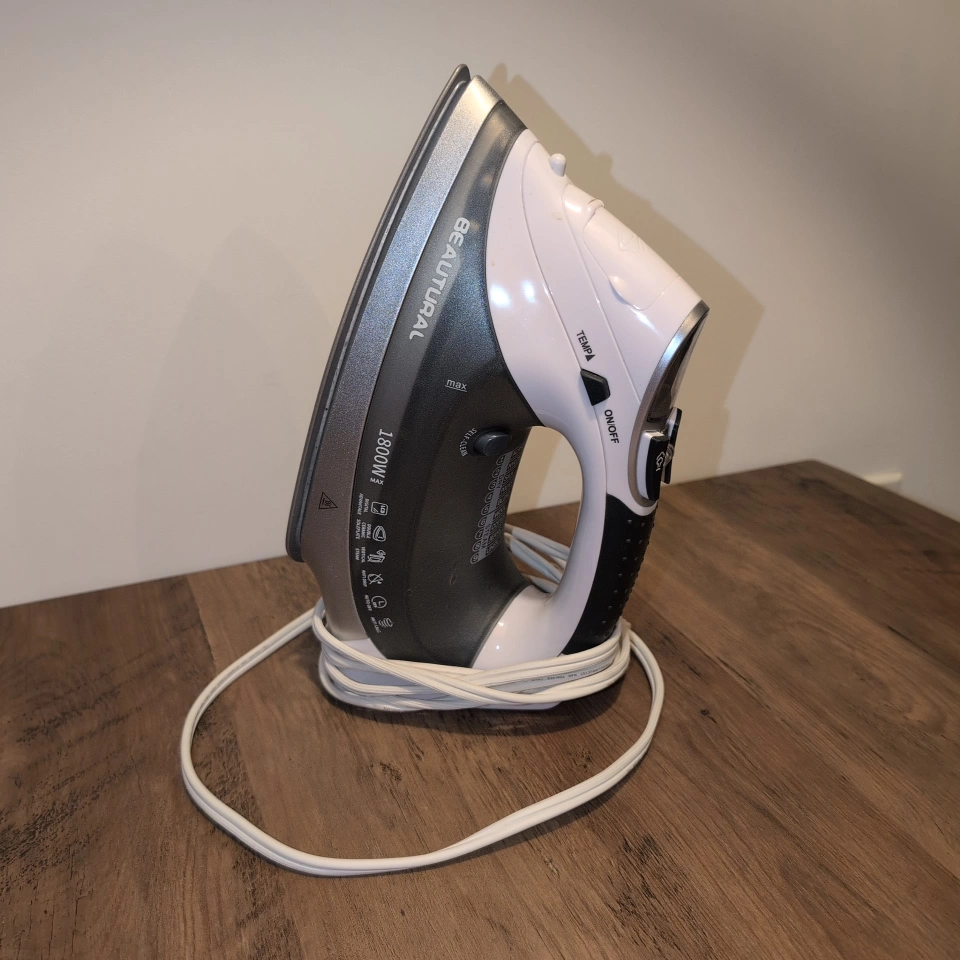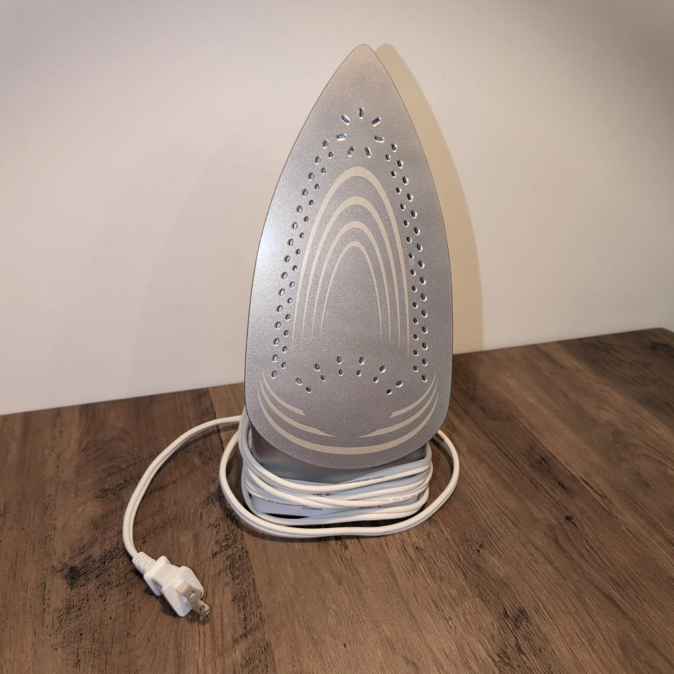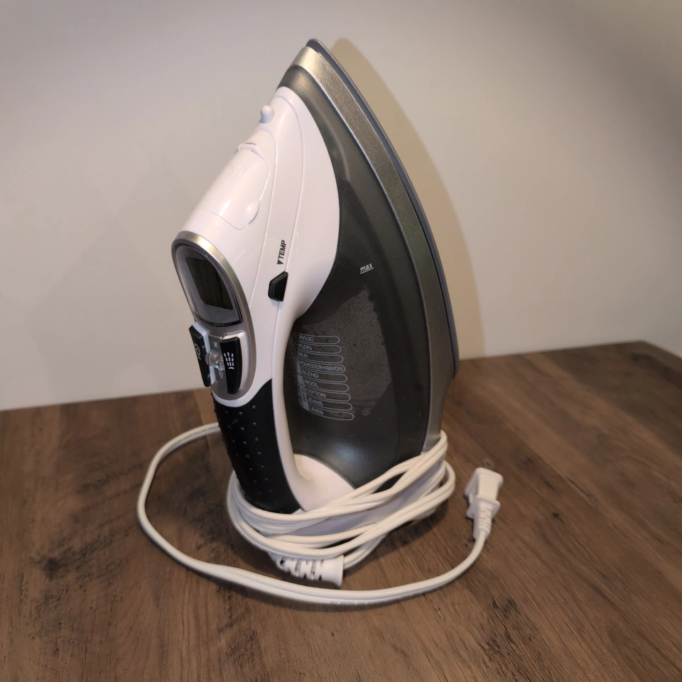 Steam iron with digital LCD screen, double-layer ceramic coated soleplate, 3-way auto-off, preset temperature and steam settings.