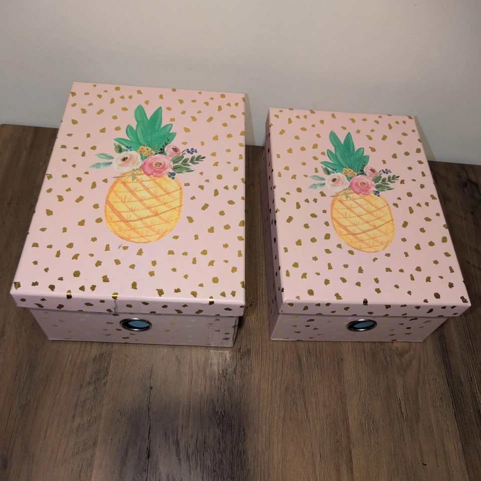 Two storage boxes with a pink background and a pineapple design. One box is larger than the other.