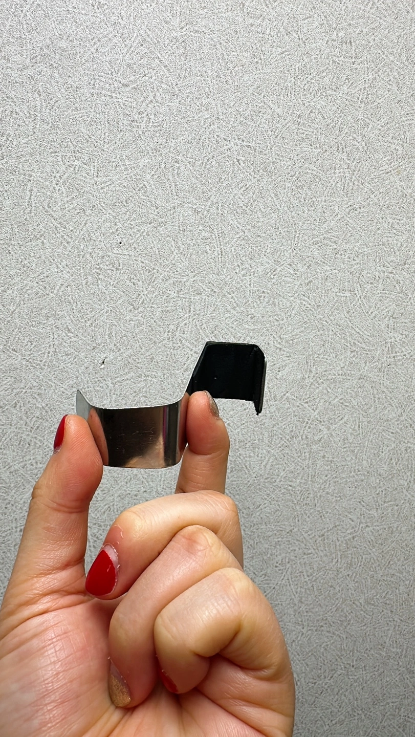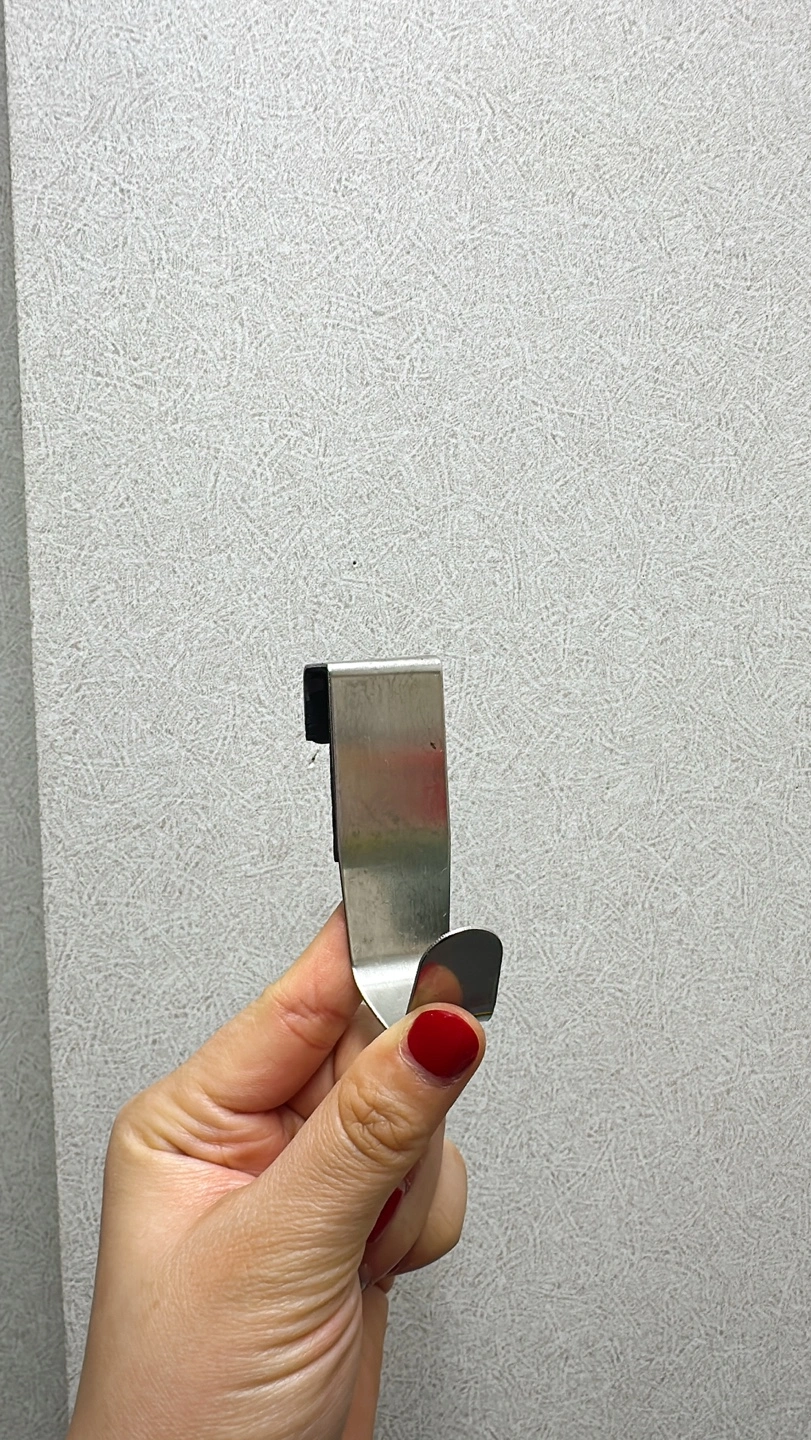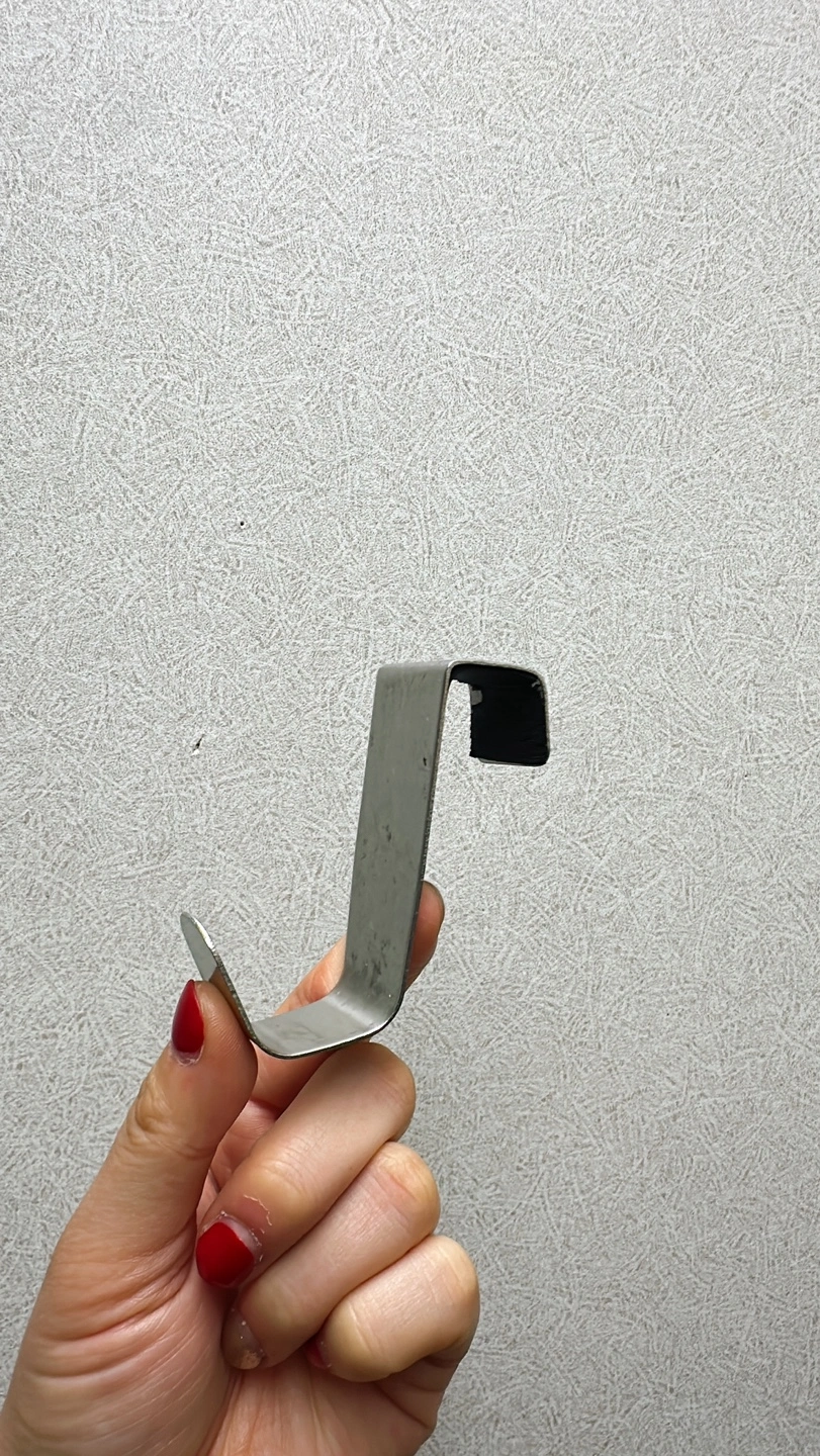 This is a metallic over-the-door hook you could use to hang a pair of oven mitts, dish towel, to other different appliances. It’s been used for some time, but it’s still in okay condition.