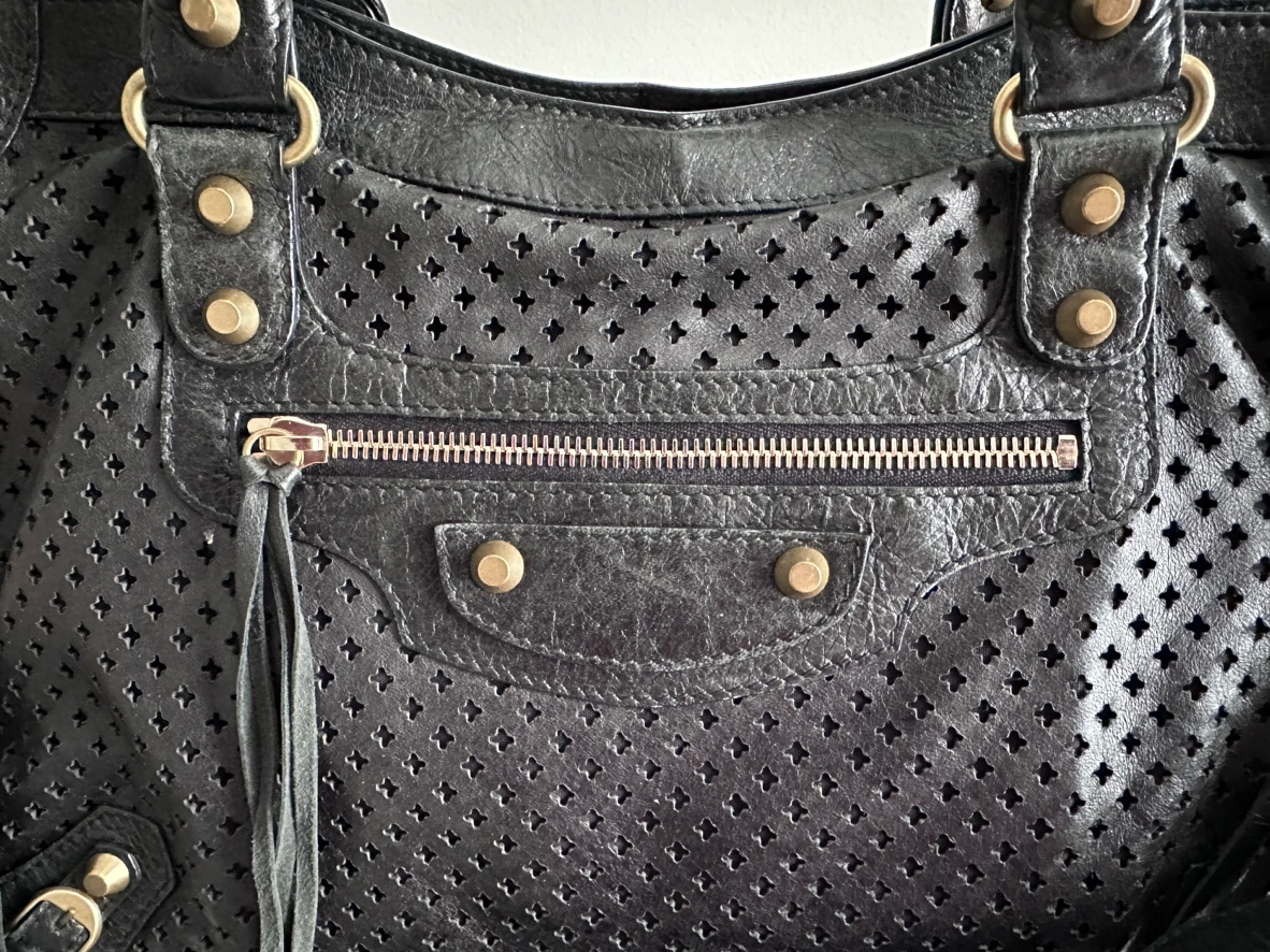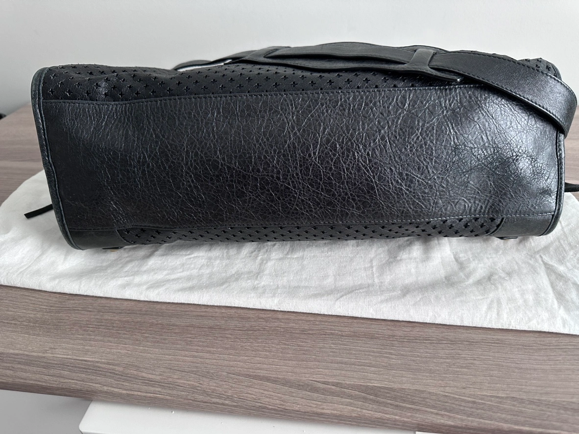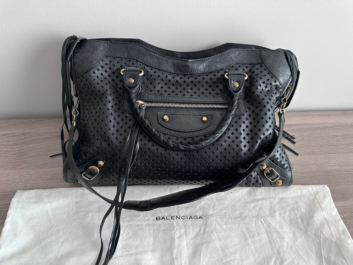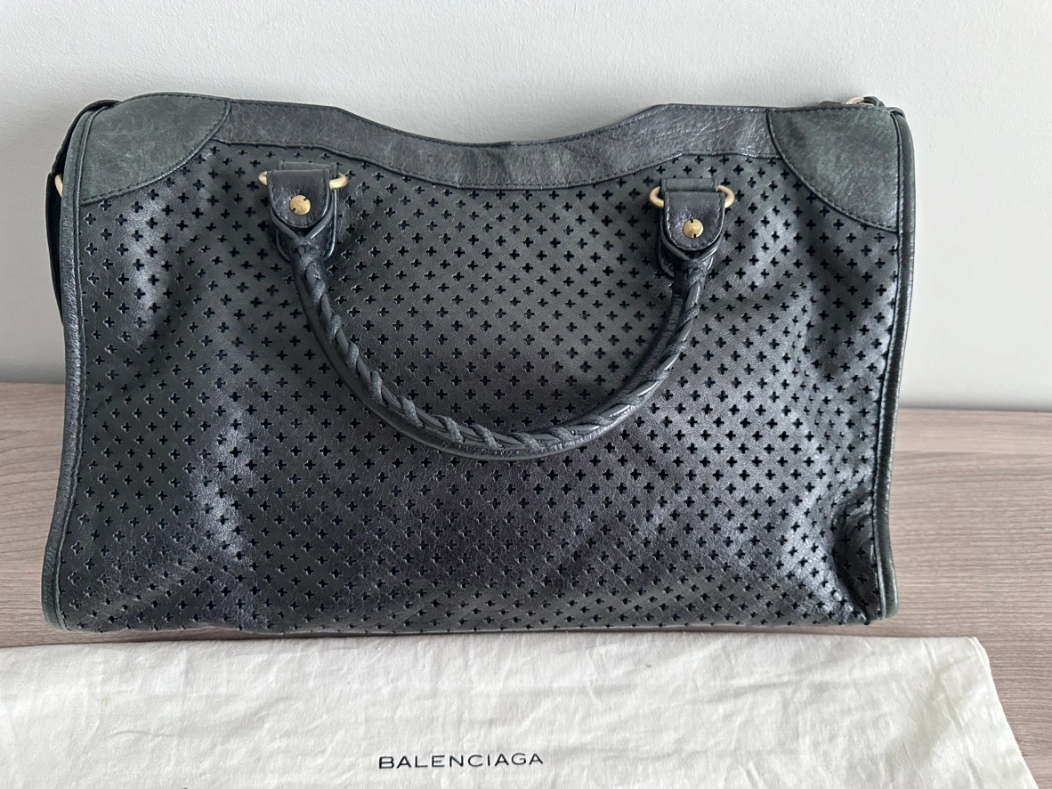 Balenciaga Womens Le City Medium Bag Black - Dimensions: L15.1 x H9.4 x W5.3 inch - Material: lambskin - Two leather hand-braided handles - Removable shoulder strap (drop: 20,8 inch) - Brass hardware - Zipped closure with knotted leather puller - Front zipped pocket with knotted leather puller - 1 inner zipped pocket - Cotton canvas lining - Made in Italy - Condition: good with slight signs of wear at bottom corners. But adds character to the vintage look! - Can fit a smartphone, a book, a tablet and a small laptop - Retails: $4000+
