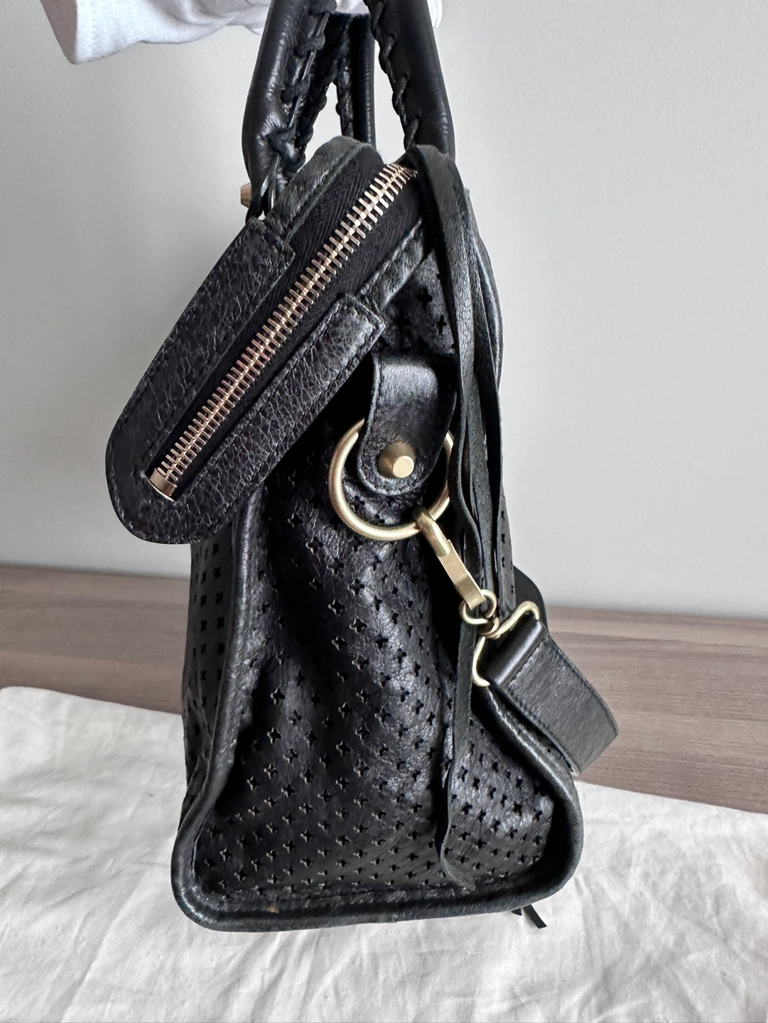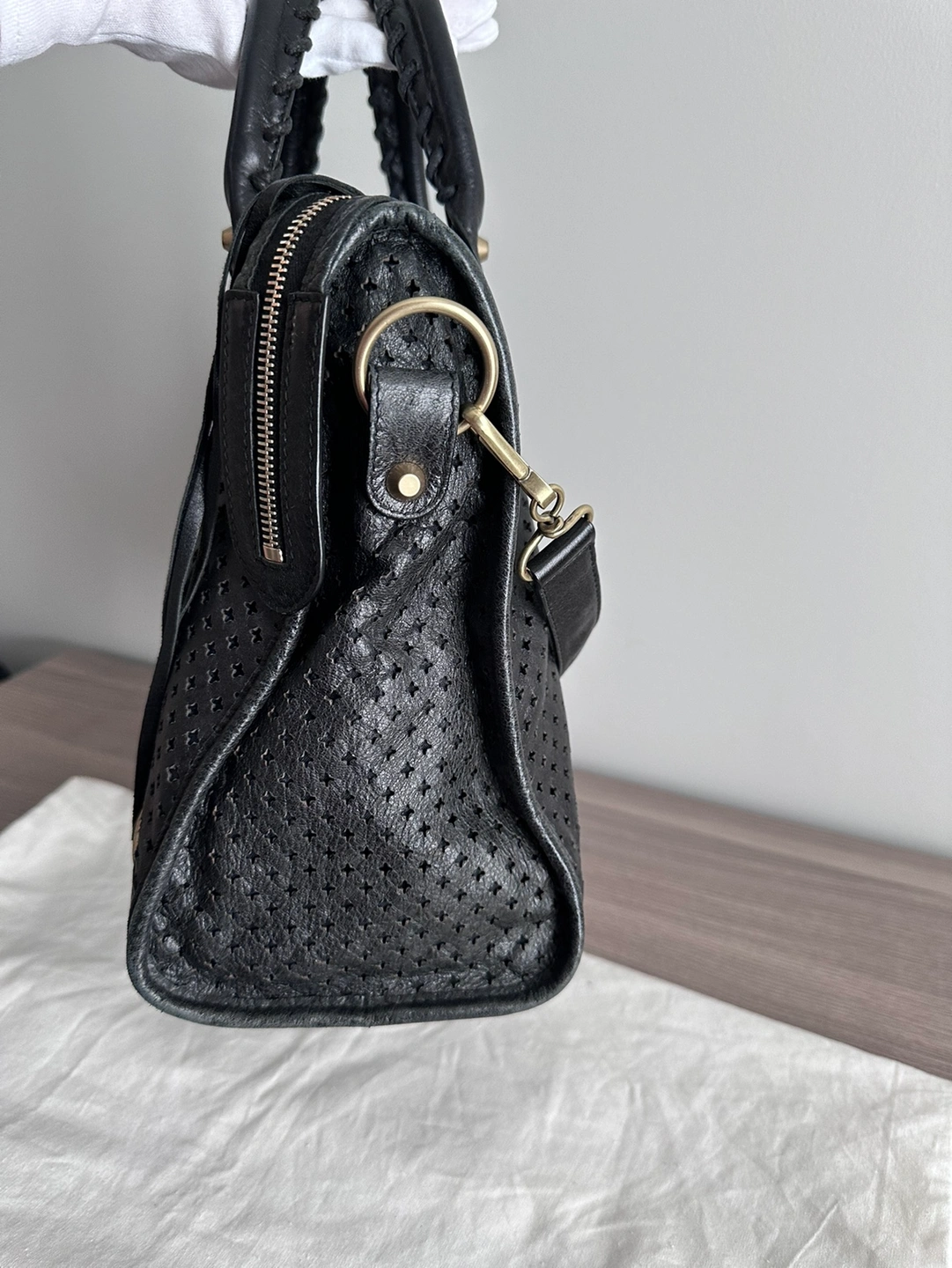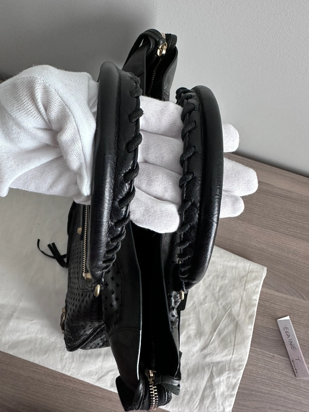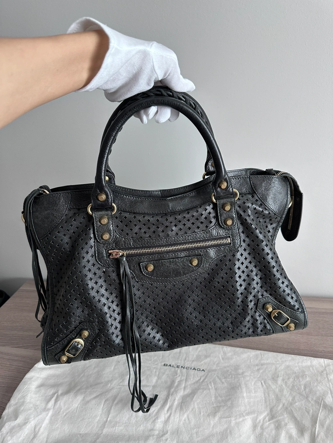 Balenciaga Womens Le City Medium Bag Black - Dimensions: L15.1 x H9.4 x W5.3 inch - Material: lambskin - Two leather hand-braided handles - Removable shoulder strap (drop: 20,8 inch) - Brass hardware - Zipped closure with knotted leather puller - Front zipped pocket with knotted leather puller - 1 inner zipped pocket - Cotton canvas lining - Made in Italy - Condition: good with slight signs of wear at bottom corners. But adds character to the vintage look! - Can fit a smartphone, a book, a tablet and a small laptop - Retails: $4000+