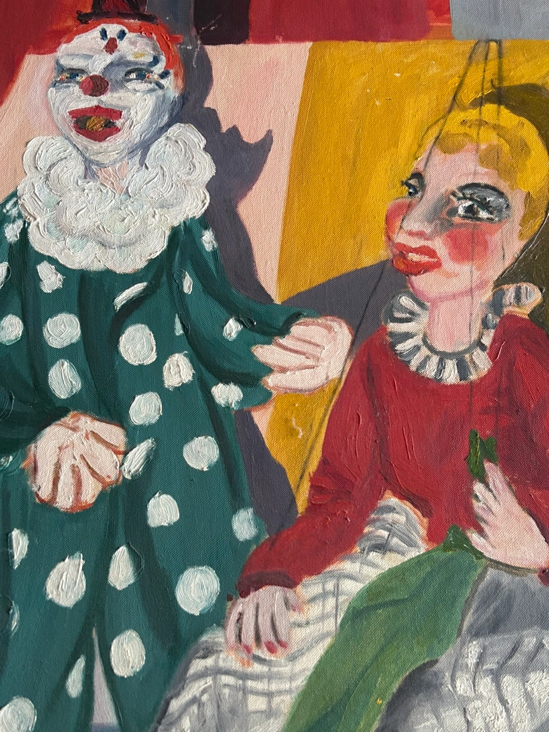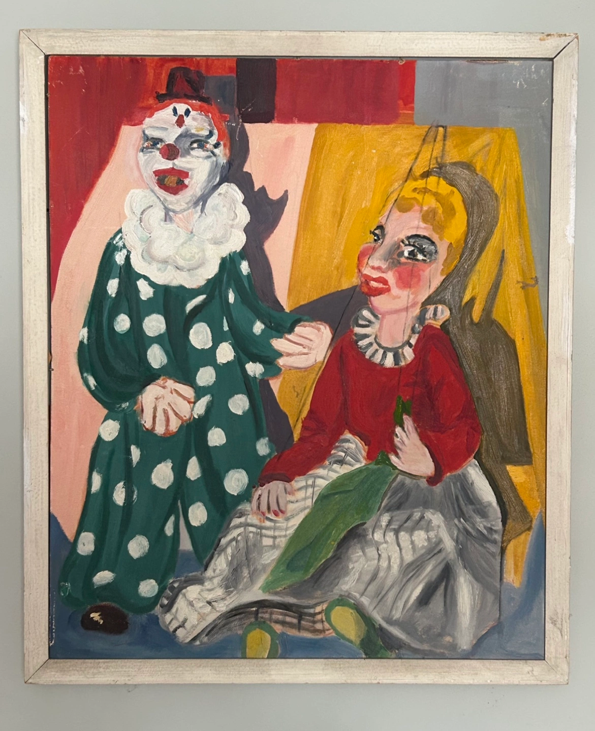 This is an original oil painting art on board 1950s /60s era This is NOT a paint by number This is beautifully and expressively painted Not signed Vintage original artwork These puppets marionette could be from Punch and Judy or maybe just clown and pretty woman 100.00 Board is 20 x 24 inch With frame about 21.5 x 25.5 inch Flexible re days time for pickup Elmsdale Road Donlands O'Connor East York M4J 3m3 Don Mills south exit off DVP