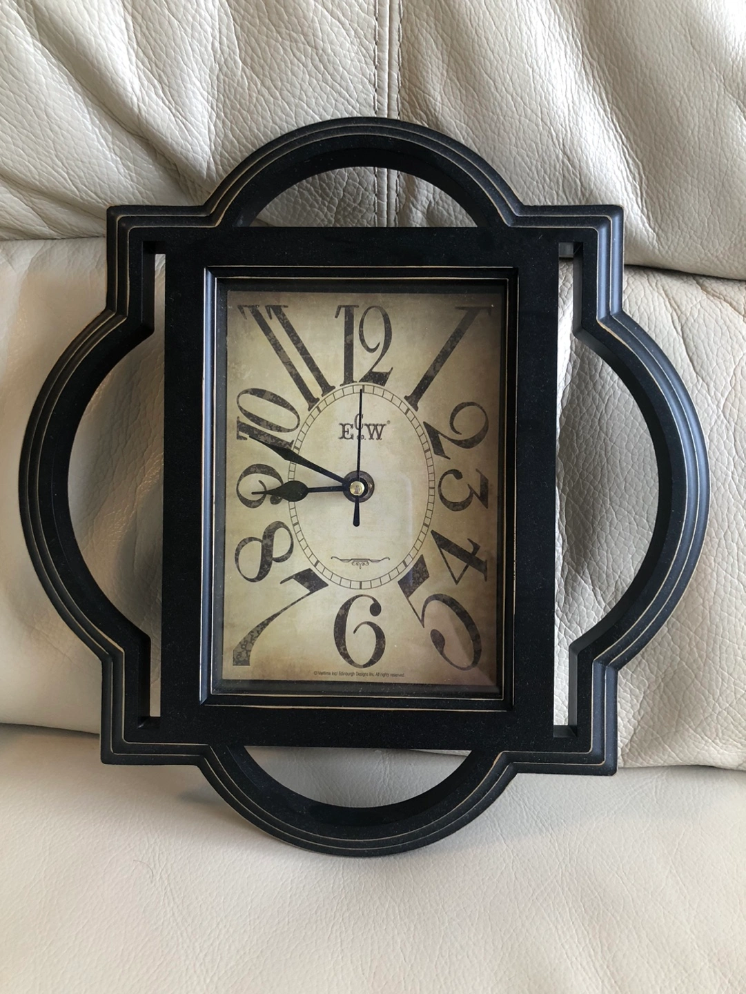 Black wall clock with ornate frame. Roman numerals and a decorative clock face. It is battery operated and already set so ready to use. Pick-up only.