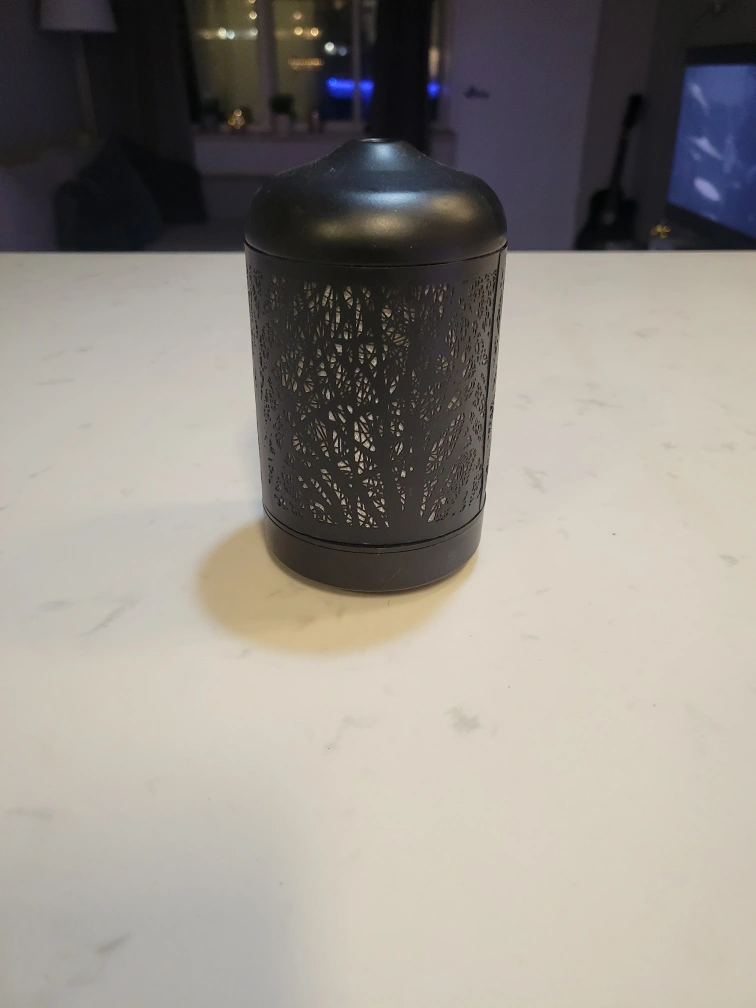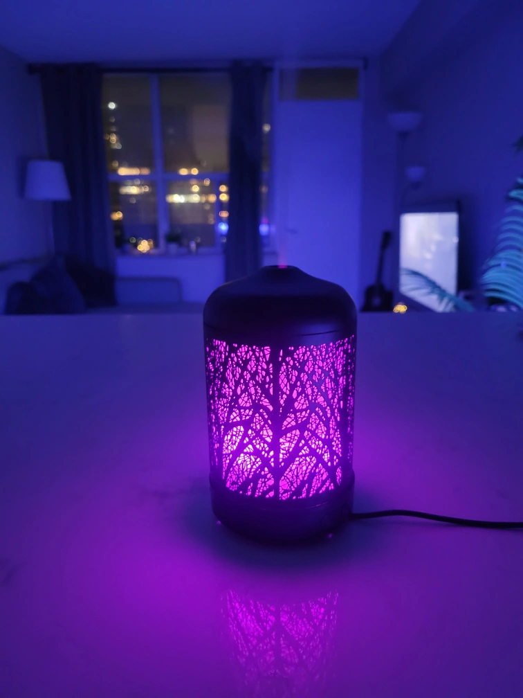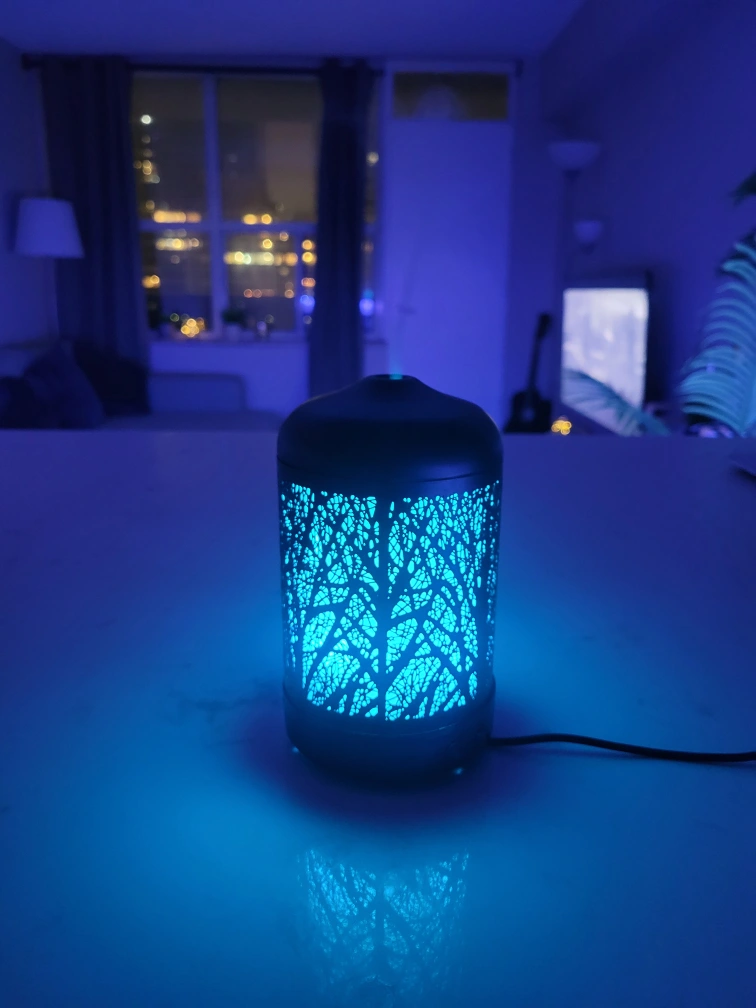 Black essential oil diffuser with a colour changing LED light. It has a tree design.