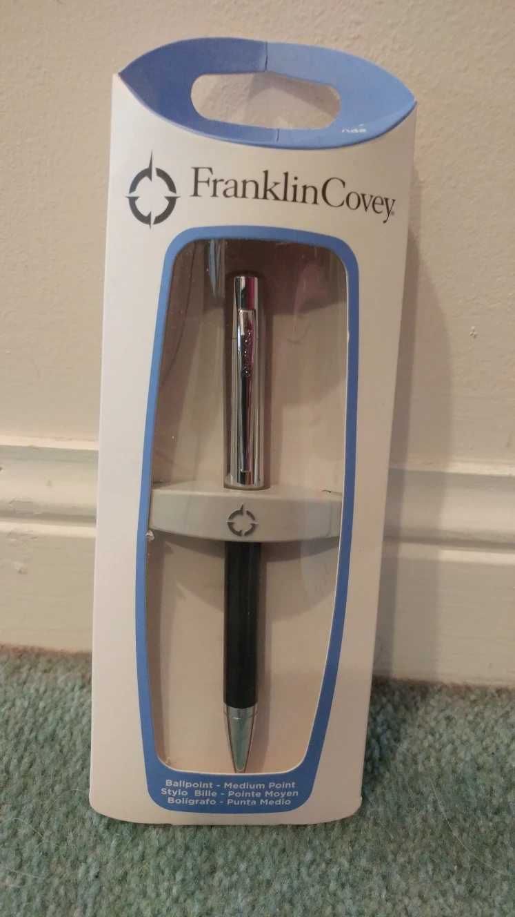 New in package, silver and black ballpoint pen.