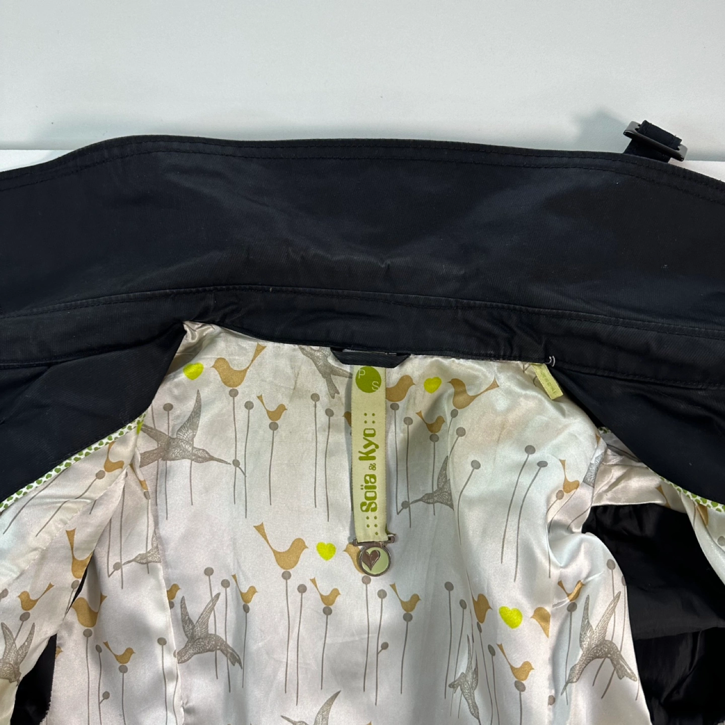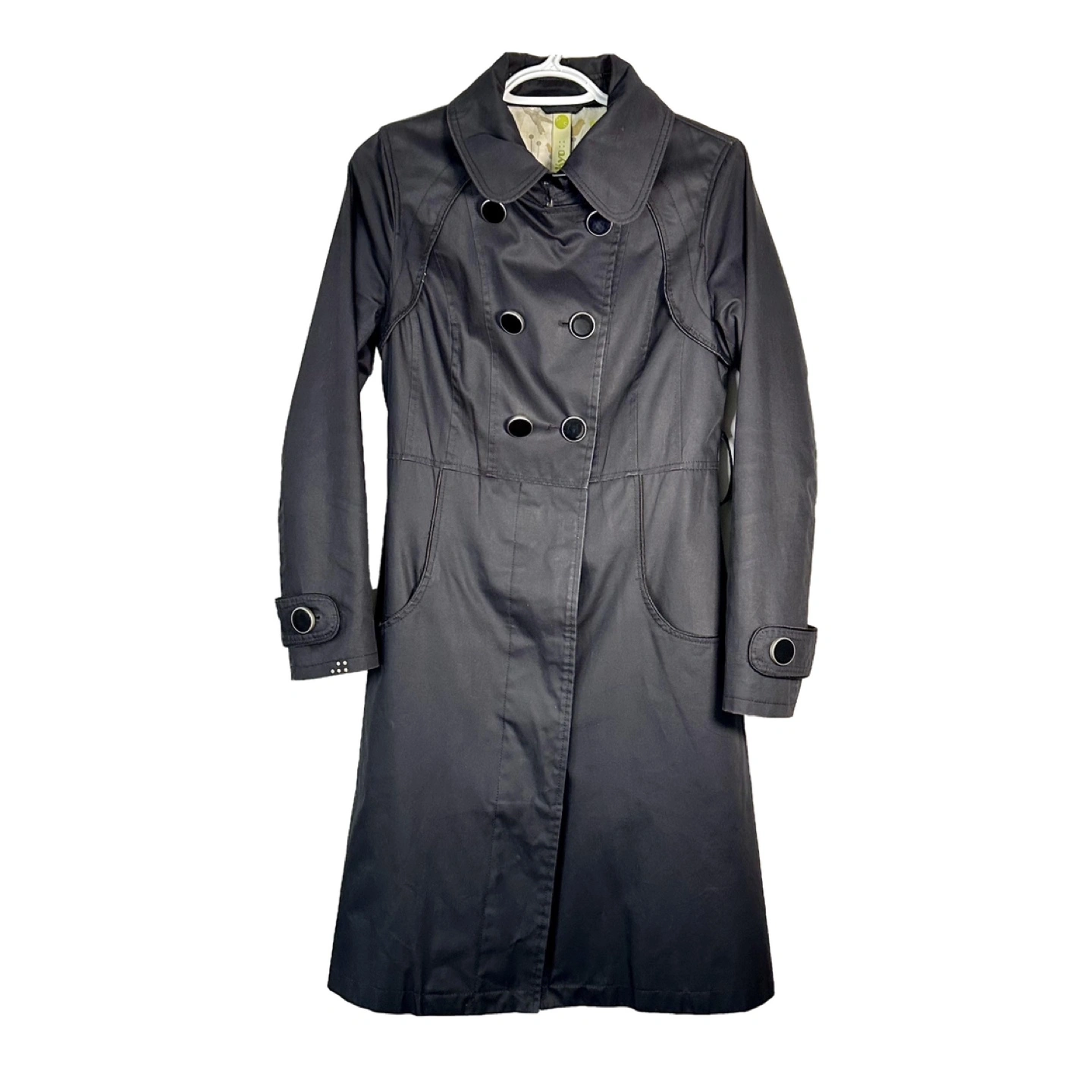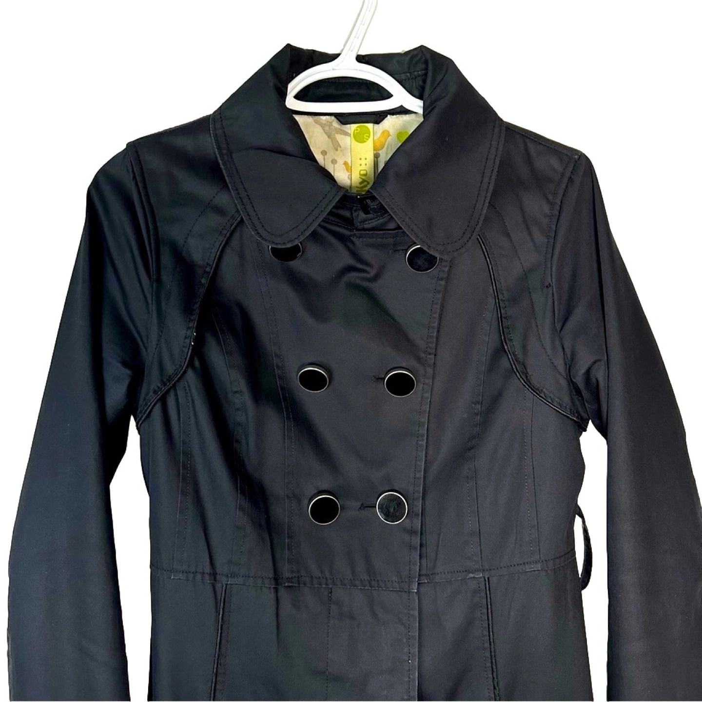 Black double breasted trench coat with a belt. Has a cute bird print lining. Long sleeves with buttoned cuffs. - Quality material - Designer trench coat - Spring and Fall essential Approximate measurements laying flat Chest : 17 inch Length : 38 inch Sleeve : 26.5 inch Belt is missing.
