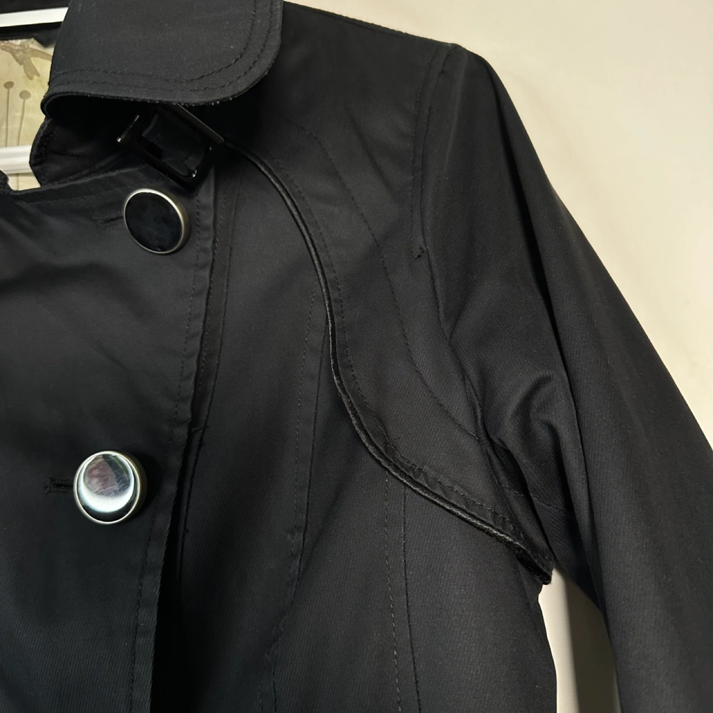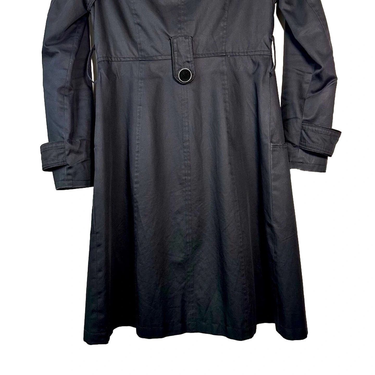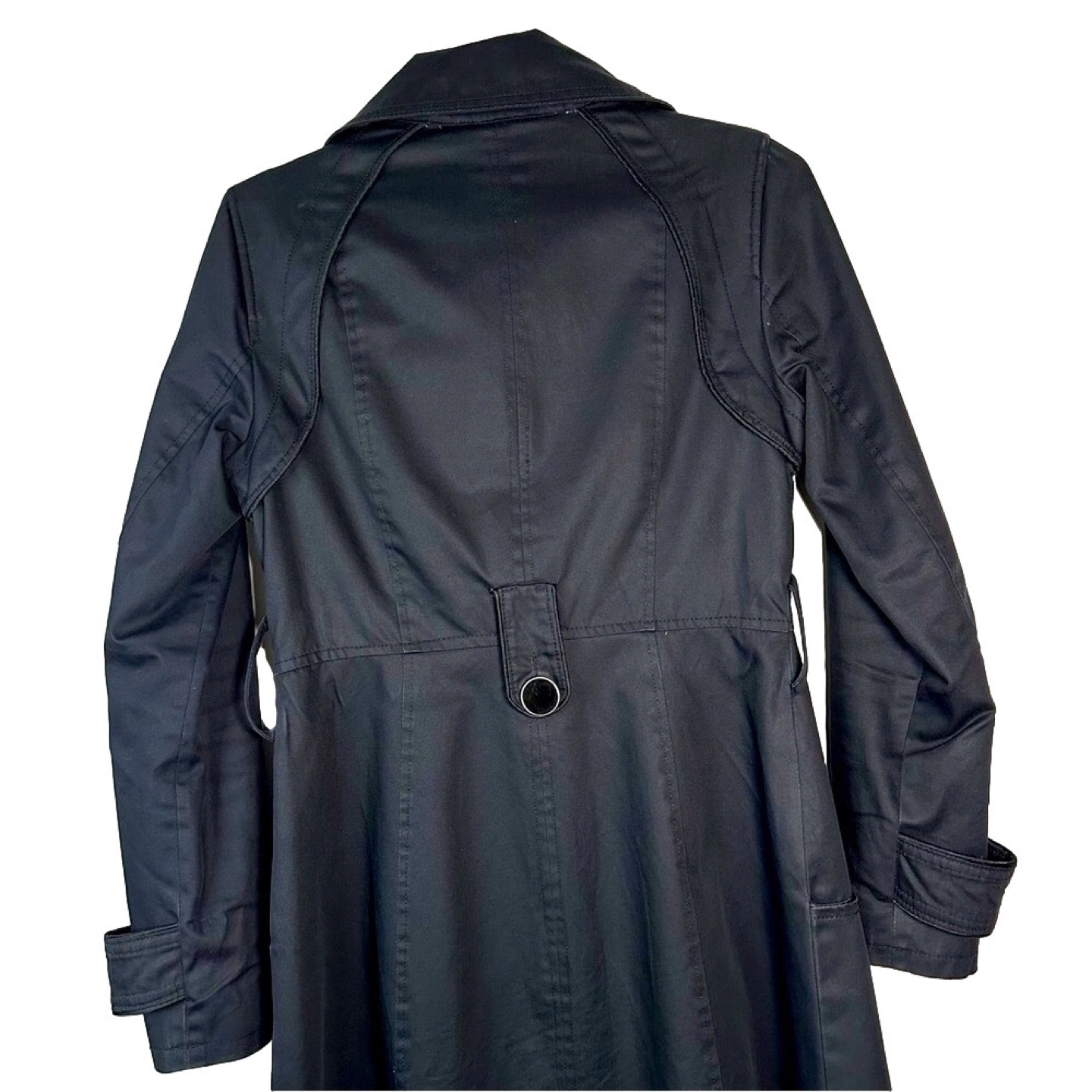 Black double breasted trench coat with a belt. Has a cute bird print lining. Long sleeves with buttoned cuffs. - Quality material - Designer trench coat - Spring and Fall essential Approximate measurements laying flat Chest : 17 inch Length : 38 inch Sleeve : 26.5 inch Belt is missing.