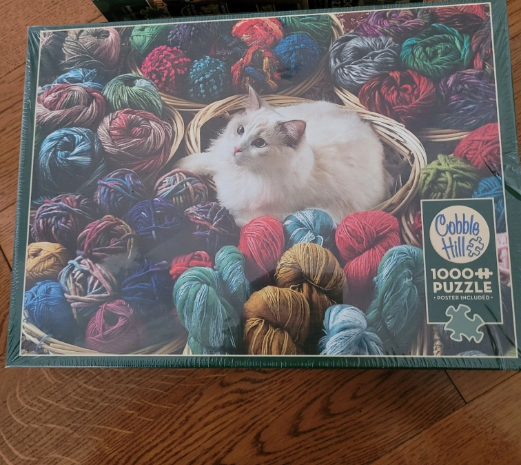 1000 piece puzzle featuring a cat surrounded by yarn. New and unopened.
