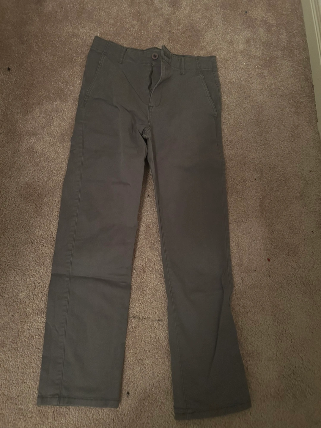Grey pants with two back pockets and two front pockets.