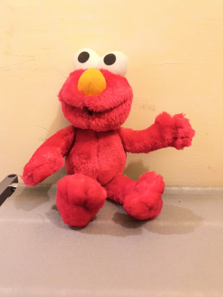 Red plush Elmo toy. Sitting with one arm outstretched.