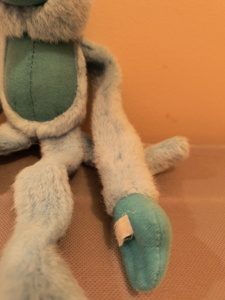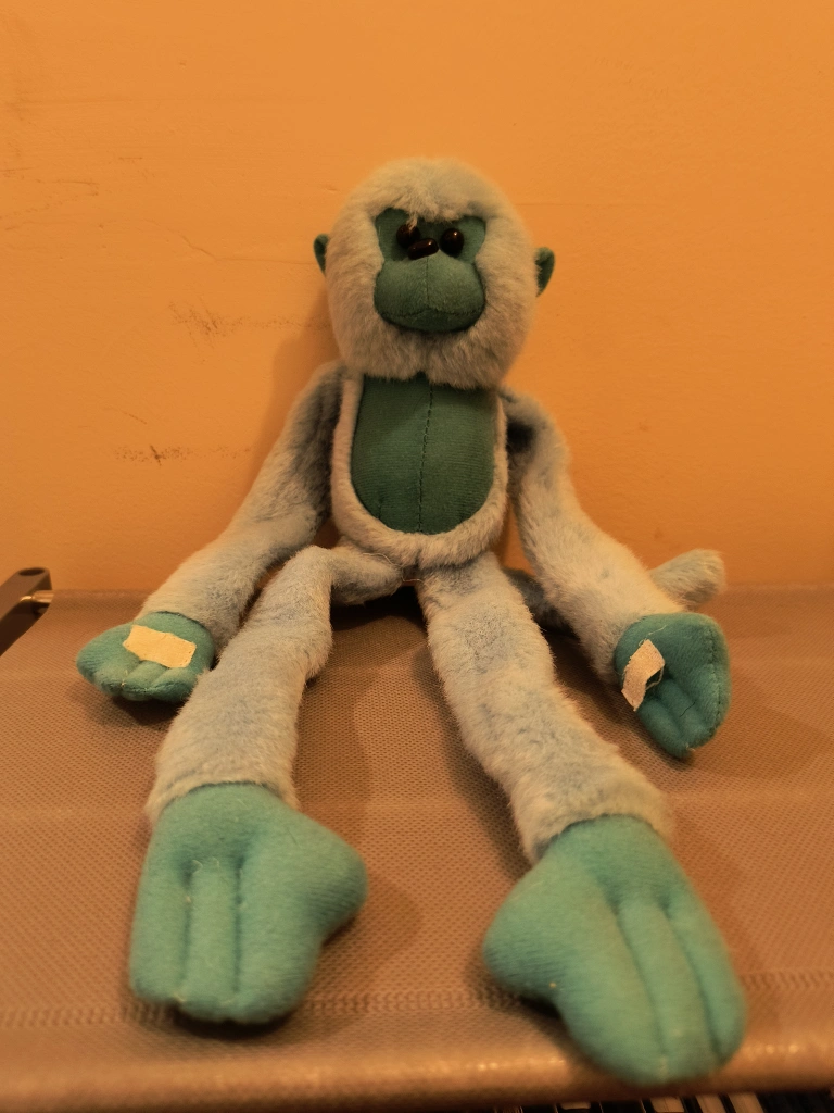 Blue monkey plush toy. Has long limbs that can be positioned for hanging. from Ganz.