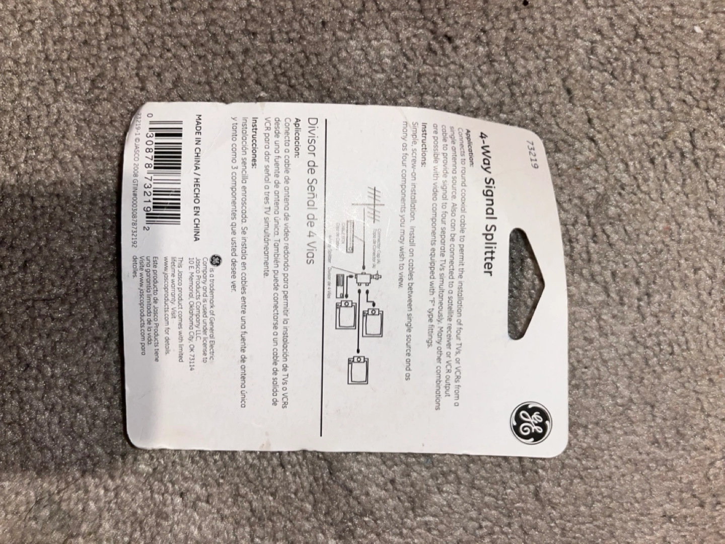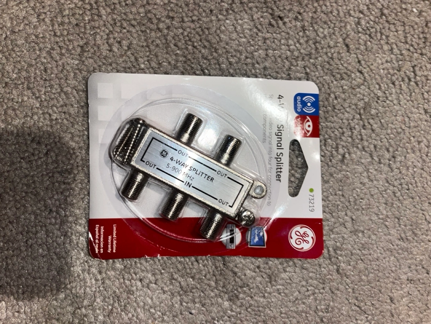 4-way signal splitter. Connects to coaxial cable. Permits the installation of four TVs or VCRs from a single source. Provides isolation required between any type source or output. Simple screw-on installation. All cables with F-type connectors. Can be used with your components. Applies to standard cable or coaxial connections. Four components may be viewed.