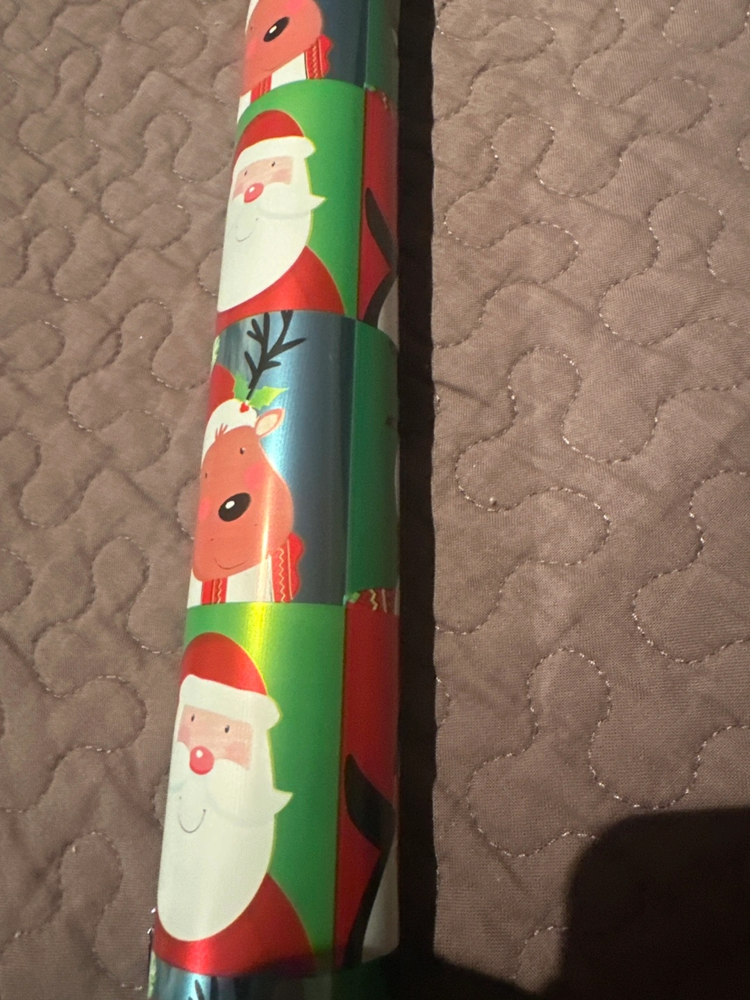 Roll of Christmas wrapping paper with a design of Santa Claus and reindeer. Metallic finish.