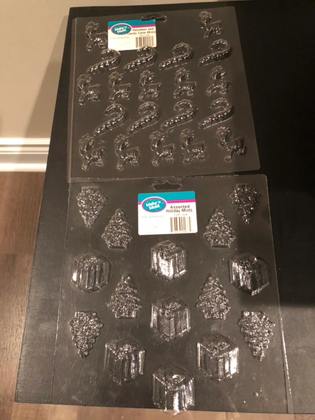 Two Make 'n Mold candy molds, one with reindeer and candy canes, the other with Christmas trees and presents.