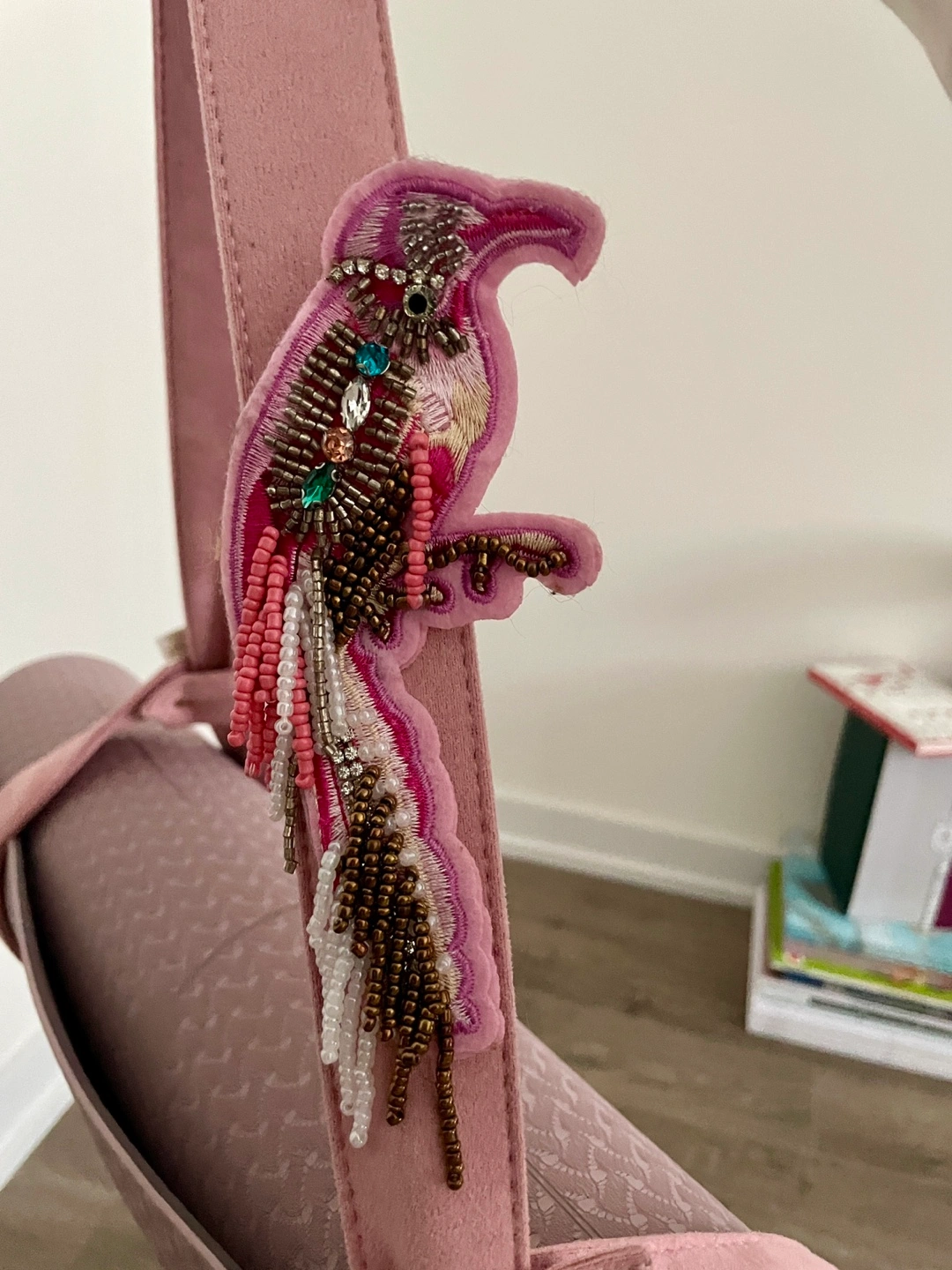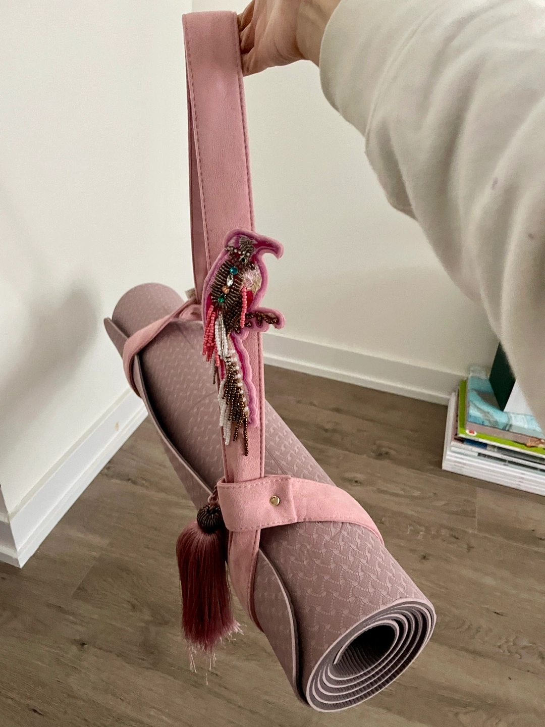 Pink yoga mat strap and beaded bird embellishment. Includes a pink tassel on the strap. 100% new