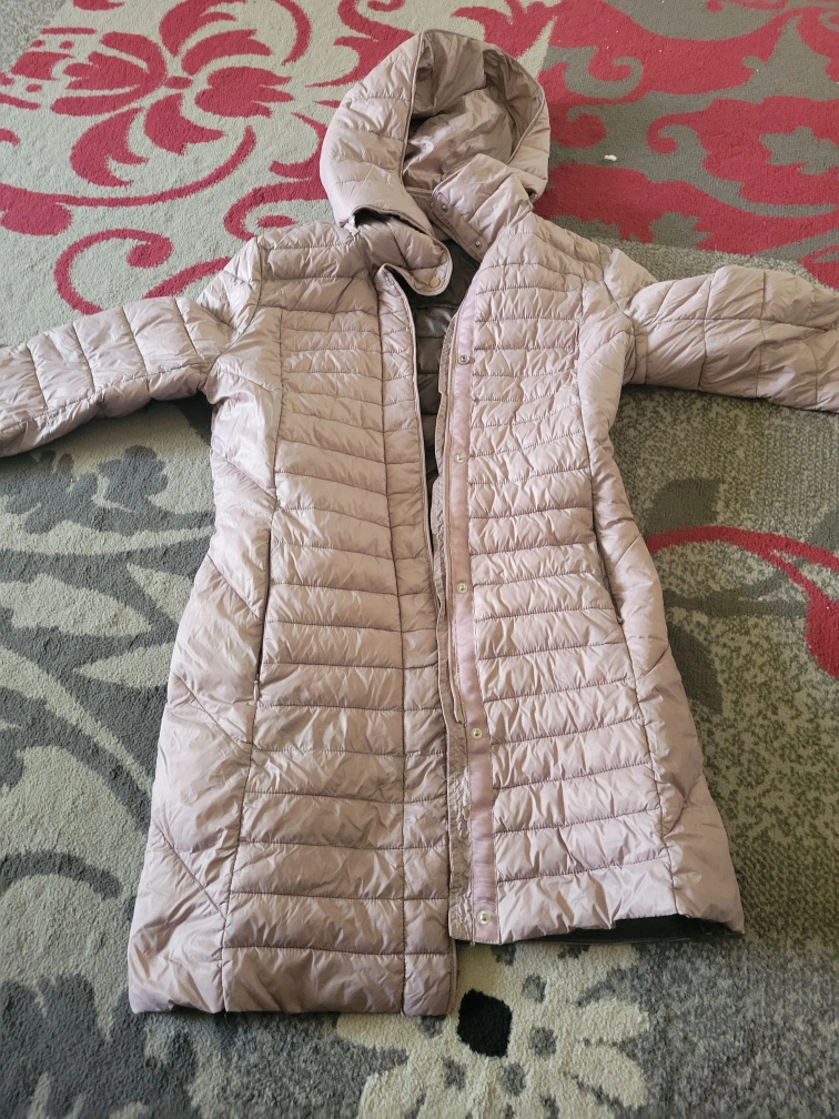 Long-sleeved pink puffer jacket with a hood. Zipper and button closure. Has pockets.