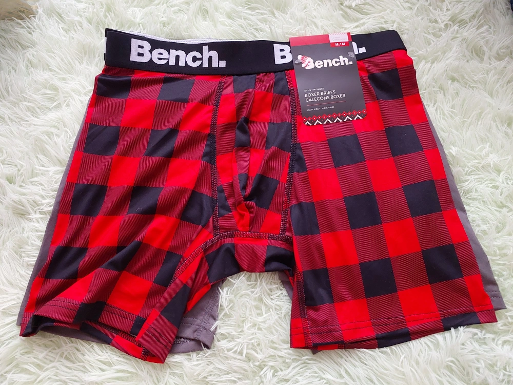 Two pairs of boxer briefs. One is grey, the other is red with a black plaid pattern.