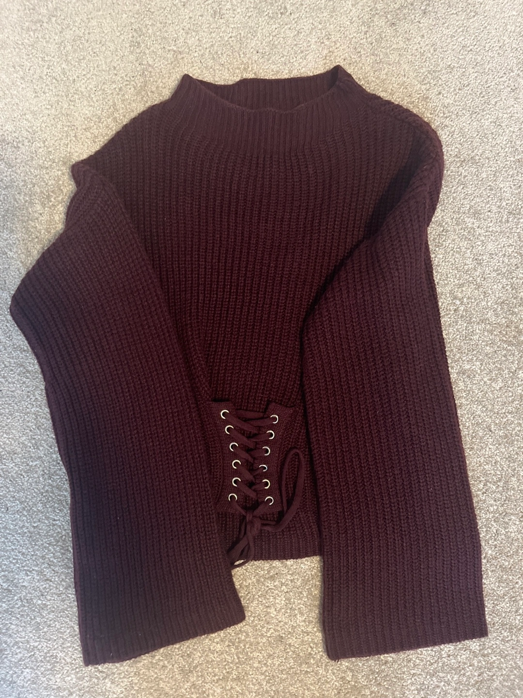 Burgundy sweater with lace up detail at the waist. Size small. New never used pet and smoke free home