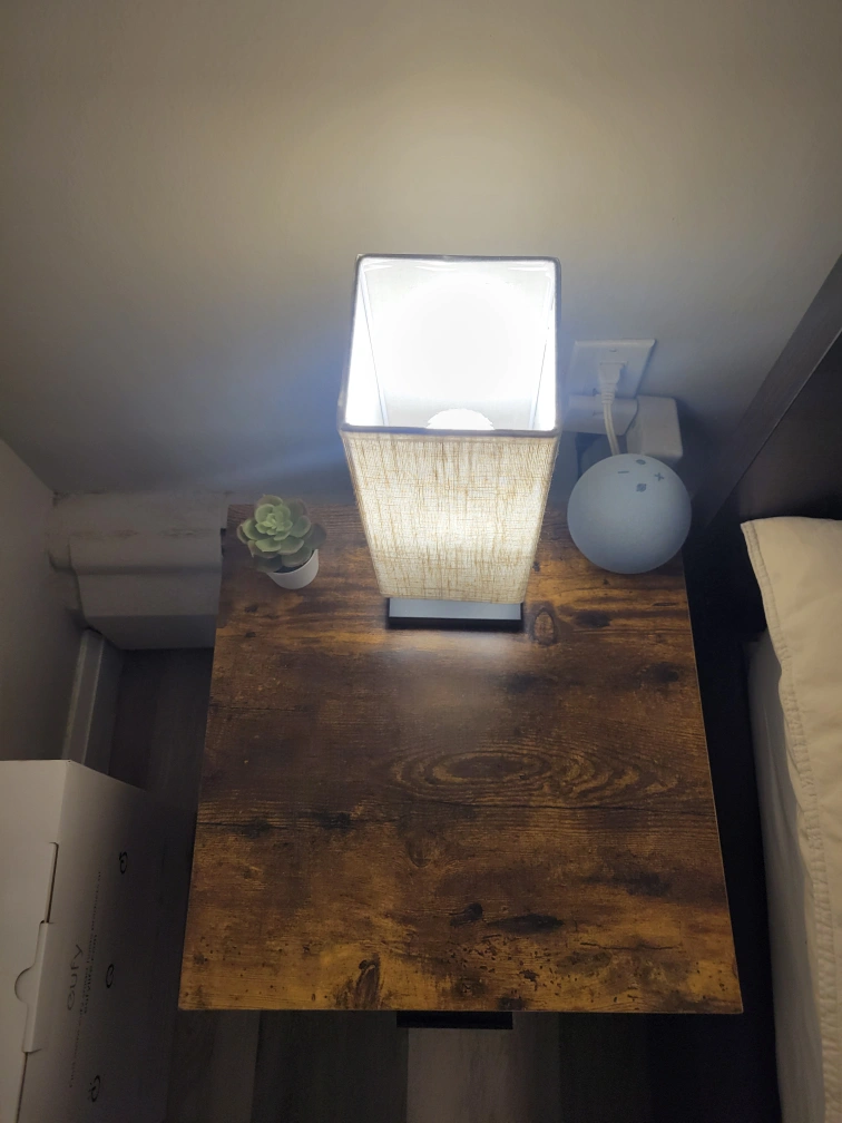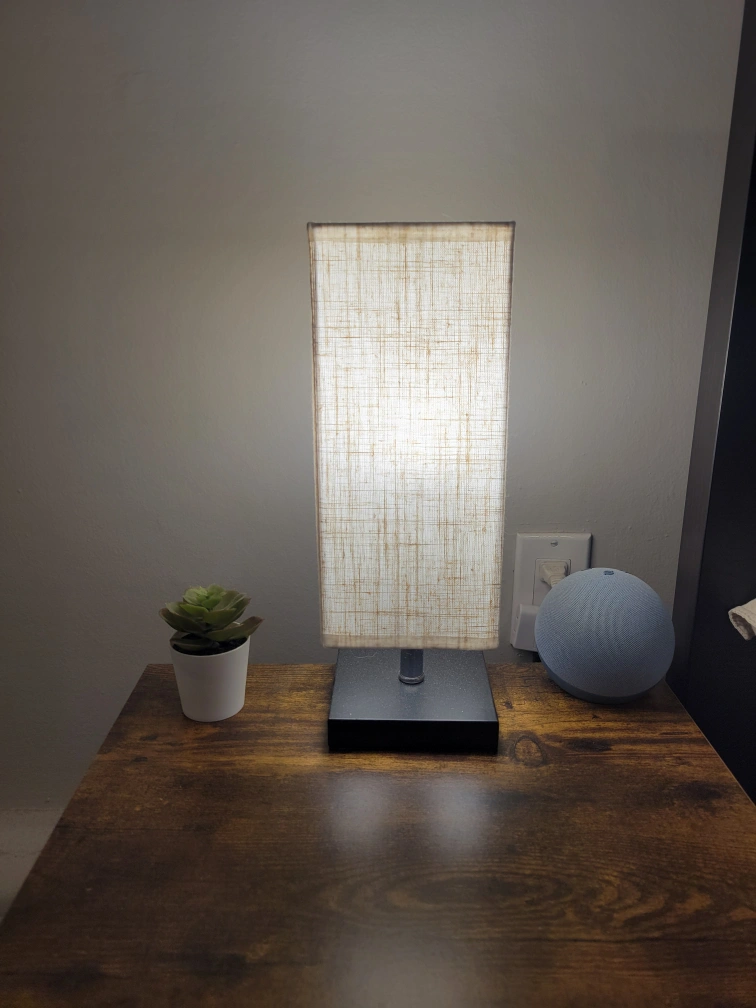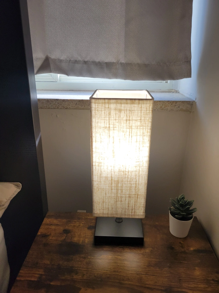Small bedside table lamp with a beige fabric shade. Has a black base and comes with a lightbulb.
