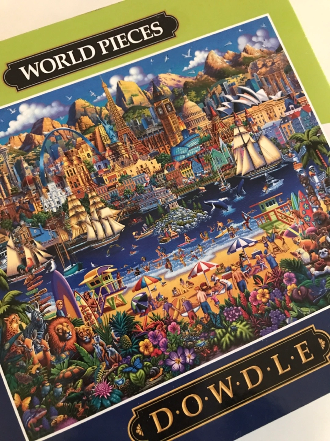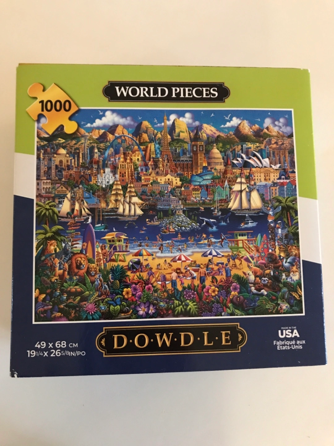 1000 piece jigsaw puzzle featuring a colourful image of various landmarks from around the world. still in its original box, no pieces missing. Used once. This was a great activity with the family this Christmas.